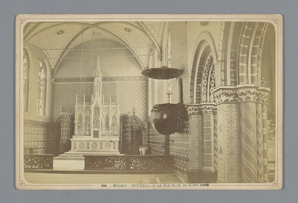 Editor: Here we have "Interior of the Abbey Church in Aduard," circa 1900, by an anonymous artist. It appears to be a photograph. The sepia tones lend an antiquated, almost ghostly air to the space. I’m immediately struck by the composition. All those linear rows of pews… What do you see when you look at this image? Curator: Immediately, I'm drawn to the intricate geometries and formal relationships at play. Consider how the artist uses perspective to guide our gaze. The rows of pews converge, leading the eye to the apse, where the play of light and shadow articulates the space. It gives dimension to the plane, yes? Editor: Yes, I see it. But I also see that some shapes contrast with the lines and angles. Like the bulbous column on the left or the curvaceous detail of the pulpit. How do they contribute to the piece? Curator: Precisely! This tension—between linear structure and decorative form—creates a dynamic interplay. We have an organized system but simultaneously disrupted. That pillar, those flourishes, provide textural variance, breaking the rigidity. Editor: Is the formal playfulness why you consider it art instead of merely an artifact or relic? Curator: Formalism values that play; we focus on the structural elements, on form rather than content. One might ask if the photograph itself elevates the subject, manipulating light and angle to create an intentional viewing experience and creating a conversation on perspective that a simple record couldn't convey. What do you make of that suggestion? Editor: Well, I hadn’t considered the photograph's formal qualities before, only the overall aesthetic mood it creates. So much to consider. Curator: Indeed. The art is in seeing, in parsing those relationships and structural elements. A rewarding exercise. Editor: Absolutely, I appreciate your thoughts. Thank you.