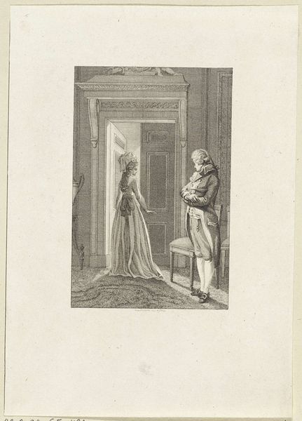 Editor: Here we have Samuel Wale's "Matthew Clark's Crime, 1721." It depicts a domestic scene, maybe a kitchen. The title gives it a narrative feel, but what kind of crime are we talking about? What do you see in this piece? Curator: I see an illustration deeply embedded in the material conditions of its production and consumption. Consider the labor involved in producing the clothing, the domestic space, and the very print itself. Who was the audience for such imagery, and what social narratives were being reinforced through its depiction of, presumably, class and transgression? Editor: So, it's not just about the kiss, but the social structure that frames it? Curator: Precisely. The "crime" becomes less about the act itself and more about its placement within a system of power and economic exchange. What's being traded, and at what cost? Editor: That gives me a whole new perspective. Thanks! Curator: My pleasure. Art's materials always tell a story.