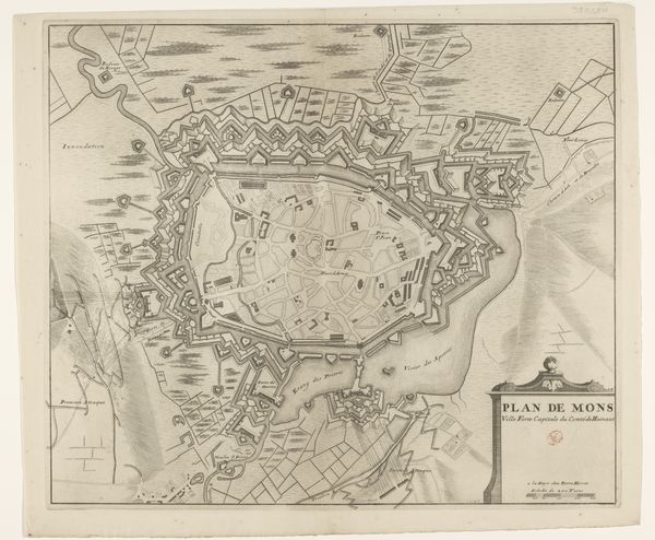 Editor: This is "Plattegrond van Namen," a print and drawing by Nicolas Suly from the early 18th century. It’s a baroque cityscape, almost like a bird's-eye view. It feels incredibly precise and detailed, yet slightly detached from the reality of life in the city. What do you see in this piece? Curator: Immediately, I’m drawn to the strategic presentation of the city. The intricate fortifications, resembling geometric patterns, speak volumes about the cultural anxieties of the time – constant threat, boundaries defined by military strategy. The radiating lines of defense become symbols themselves, warding off not just physical invaders, but also the chaos of the unknown. Do you notice how the natural landscape is subservient to the imposed order of the fortifications? Editor: Yes, the forts definitely dominate the view. The river and surrounding land seem almost secondary, arranged around those star-shaped structures. Does the rendering style give clues? Curator: Absolutely. The sharp, precise lines emphasize control and a desire for rational understanding. It’s not just about showing Namur, but about mastering it, containing it within a visual framework. Think about the power dynamics embedded in the act of mapping itself – to map is to claim, to understand, to potentially control. Does that change your interpretation at all? Editor: Definitely. It shifts my focus from just seeing a city to considering how it was being perceived and controlled, or at least how the powerful wanted it to appear. It feels almost like propaganda disguised as cartography. Curator: Precisely. This blend of utility and veiled ideology highlights the fascinating way images serve as cultural touchstones, embedding values and reinforcing societal structures long after their creation.