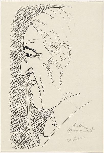 Curator: Welcome. We are looking at a pen drawing called "Bananmand", created some time between 1897 and 1949 by the Danish artist Robert Storm Petersen. It resides here at the SMK, the Statens Museum for Kunst. Editor: The most striking thing is its playful simplicity. Just a few bold, confident lines, yet it conveys so much character. There’s a real expressive energy in this figure. Curator: Petersen was indeed known for his humour and satirical commentary. Much of his work reflects the everyday life and culture of Copenhagen during that period. One must ask: how did his social circumstances inform this character? Editor: Look at the details: the almost absurdly thin neck, the slightly crossed eyes. The high collar, meticulously rendered, sharply contrasts with the looseness of the coat. It’s a caricature, but with warmth, I think. Curator: Precisely. Petersen’s cartoons often highlighted the foibles and eccentricities of ordinary people. And one cannot ignore the time in which he was making art, the world wars loom large here; these artistic practices represent cultural relief. Editor: Yes, there’s something very immediate and present about the linework. You can almost see the artist's hand moving across the paper; the deliberate choice of medium helps deliver his desired aesthetic. Curator: These images provided a source of comfort and comic relief amidst serious historical change, finding humor even in times of societal hardship. The artist helped shape and reflect Danish culture. Editor: This small drawing feels like a testament to the power of simple lines to capture a character and an era. So playful, yet it speaks volumes about its historical context. Curator: It’s more than just a sketch. It’s a social artifact, a tiny mirror reflecting a slice of Copenhagen’s past, wouldn’t you agree? Editor: I completely agree; one is taken by its form, but equally seduced by what it communicates from then until now.