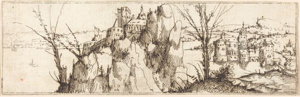 This is Augustin Hirschvogel’s "Landscape with Fort and a Church on a River," made with etching in the 16th century. Hirschvogel, an artist active during the Renaissance, lived in an era defined by the rise of humanism, religious reform, and the expansion of geographical knowledge. In this landscape, there is a fort and church. These architectural structures reflect the power dynamics of the era. The fort symbolizes the temporal authority and military might, while the church signifies spiritual influence. The river itself might have served as a crucial means for trade. The setting in nature suggests a world where humanity and the environment were deeply intertwined. Hirschvogel's delicate etching captures the emotional nuances of the scene, inviting viewers to contemplate the relationship between power, faith, and the natural world.