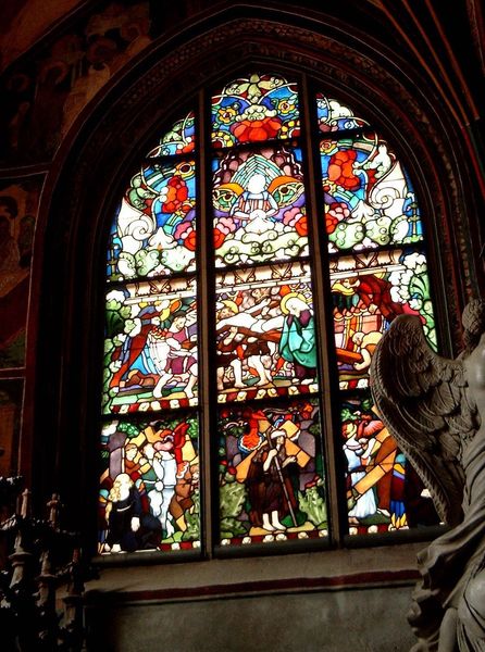 Józef Mehoffer created the stained glass window, "Our Lady Victorious," for Fribourg Cathedral. Mehoffer lived through a period of intense political and social change in Poland. Through the lens of gender and power, this work offers a rich tapestry of symbolic representations. At the heart of the design is Mary, a powerful female figure, framed by angelic beings. She is a strong maternal figure, embodying the traditional expectations of women to be virtuous mothers, while at the same time, the composition alludes to her agency in salvation. This piece develops an alternative narrative that seeks to empower a female figure within a historically patriarchal context. The window's design combines traditional religious motifs with modern artistic sensibilities, reflecting the intersection of faith and modernity. As you gaze upon the artwork, consider its place within the context of both religious tradition and the artist's own experiences. Notice how it shapes societal views on faith, gender, and power.