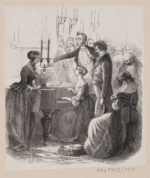 H.P. Hansen made this illustration for Hans Christian Andersen's tale "Under the Willow Tree." The black and white print captures the wedding of a young couple, surrounded by onlookers, with flowers scattered on the ground. Hansen’s illustration reflects the 19th-century Danish society's complex attitudes toward class and social mobility. The tale, like this image, is a window into a world where romance and social expectations were tightly intertwined, particularly for women. The bride's demure posture and elegant dress speak to the performance of femininity expected of her, while the crowd's gaze underscores the public nature of her transition into married life. The contrast between the well-dressed couple and the more informally attired onlookers also subtly hints at the economic disparities that were part of daily life in Denmark at the time. Hansen's image doesn't just depict a wedding; it encapsulates the hopes, dreams, and unspoken pressures that shaped individual lives within the broader social fabric.