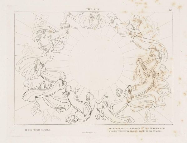 Curator: This is John Flaxman’s drawing, "The Active Good," housed in the Tate Collections. What strikes you immediately? Editor: It’s ethereal, almost like a dream. Figures draped in flowing garments, like spirits ascending. There’s a solemnity to its simplicity. Curator: Flaxman, active in the late 18th and early 19th centuries, here employs a linear style, reducing form to its essence. Notice how the lines create a sense of movement, particularly in the drapery. Editor: And the central figure scattering stars – a beautiful, hopeful gesture. I wonder what Flaxman wanted to convey with this symbolic act. Curator: The artwork’s title gives us a clue. It invites reflection on what it means to perform "active good." Perhaps it's about legacy, as indicated in the phrases inscribed beneath the image, the wish "to win a deathless name." Editor: It makes me think about what actions ripple outwards, impacting those around us. A fitting consideration.