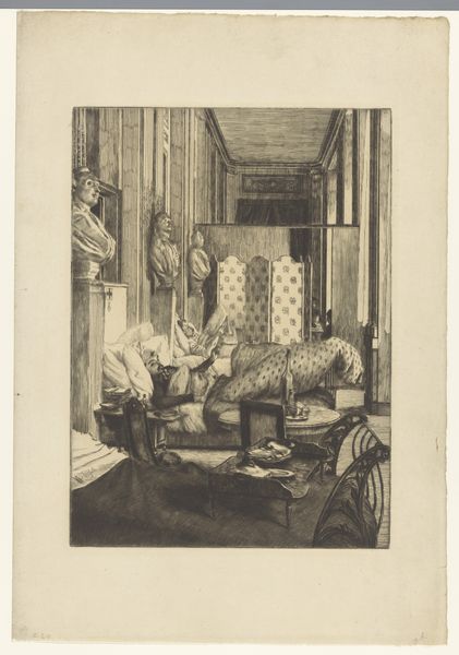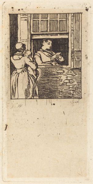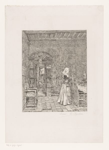 Albrecht de Vriendt created this print titled 'Woman Spinning Wool by a Cradle' using etching. De Vriendt was part of a wave of 19th-century artists who turned to the past for subject matter. Here, we see a domestic scene where a woman spins wool near a sleeping infant. It seems timeless, yet it's also revealing of the artist’s time. The print romanticizes the role of women, depicting them in the domestic sphere, quietly tending to the home. We should also consider the artist's own context. As a white, male artist working in the 19th century, his perspective would have been shaped by the social norms and expectations of his time. Although seemingly a scene of peace and quiet, it prompts us to think about the labor, often unseen and unacknowledged, that goes into maintaining a home. It speaks to the complex relationship between visibility and invisibility, work and care, in the lives of women.