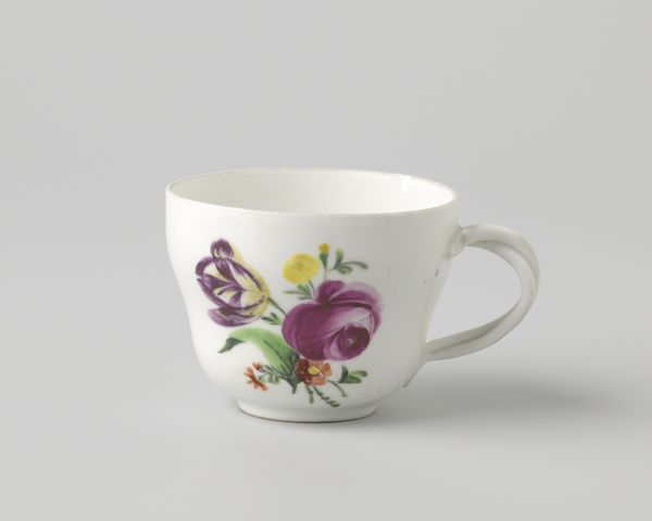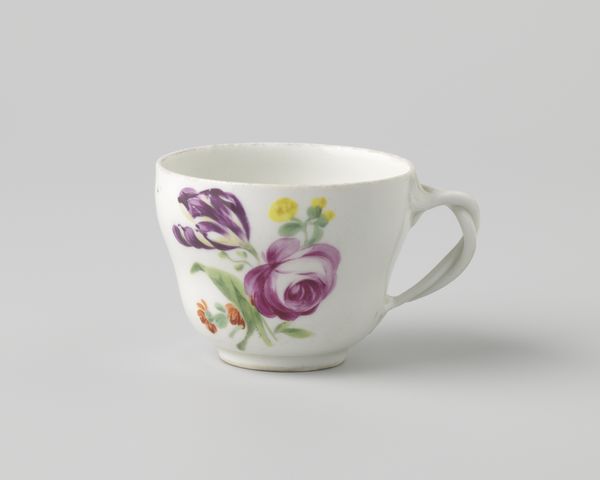 Editor: This is a beautiful porcelain cup, dating from around 1760 to 1800. It’s decorated with delicate floral sprays, and comes from Ansbach. I find the details quite lovely. What do you notice about the materiality and craft here? Curator: What strikes me is the porcelain itself. Consider the Kaolin clay needed – where was it sourced, and under what conditions? Its whiteness was so highly prized, directly tied to ideas of purity and luxury for its aristocratic owners. The Rococo style with its elaborate, asymmetrical forms suggests a high level of skill, a controlled performance. Editor: That’s interesting. I was focusing on the painted decorations. Curator: The overglaze painting is also crucial. These aren't simple decorations, but signifiers. The labour to create them was often divided among different artisans, some specializing in floral motifs. It suggests a mini-factory of sorts, geared toward mass production of luxury goods, right? It moves away from this idealized lone artist. Editor: So you see the division of labor as key? How does that relate to the cup's value? Curator: Absolutely. Understanding the material and labour processes allows us to unpack the complex social dynamics embedded in this seemingly simple cup. Who benefited from its creation? Who was exploited? What was its actual purpose? Also how access was granted for trade – who could acquire such items, what colonial resources facilitated their distribution and value, and who ultimately consumed it? Editor: I hadn’t thought of all that when I first looked at it. I was simply admiring the floral decoration. It definitely brings new questions and ideas to mind now. Curator: Precisely! Seeing the cup through a materialist lens transforms it from a pretty object to a source of deeper socio-economic investigation.