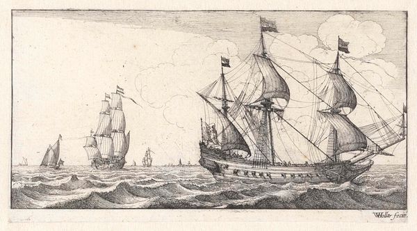 Editor: We're looking at "Two Warships with Sails Hoisted," an etching by Wenceslaus Hollar, created sometime between 1627 and 1636. It’s quite a lively scene! I’m struck by how turbulent the sea looks, even though it’s just lines on paper. What really grabs your attention about this piece? Curator: You know, sometimes I think the best art teaches us to see with fresh eyes. Look at the waves – each line tells a story of movement and force, even the clouds seem to have personalities. Hollar doesn’t just depict ships; he captures a drama unfolding on the water, doesn’t he? Almost as if he's whispering a maritime poem. It makes you wonder about the real events that inspired this sketch; maybe a sea battle, or the sheer thrill of exploration? What kind of story do you think it suggests? Editor: A sea battle makes sense, given that they’re warships! The drama comes through even in a relatively small print. Do you think the medium, etching, contributed to this feeling? Curator: Absolutely! Etching lends itself to intricate detail, that web of lines giving form to both ship and storm. Think of it—metal and acid conjuring up wind and wave. Incredible, isn’t it? It almost has this feel like a news report. Editor: I never thought about it like that. Like an old-fashioned news image. Curator: Exactly! He gives you what he sees and allows your imagination to soar into the details. It seems like he's saying, ‘Here’s a slice of the world; what do you make of it?’ Editor: So it’s both an observation and an invitation. I see it now. Thanks! Curator: Anytime! Remember art is just about asking, seeing and imagining something new in the commonplace.