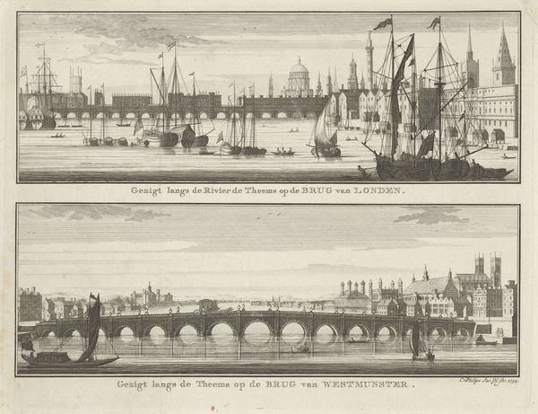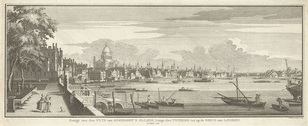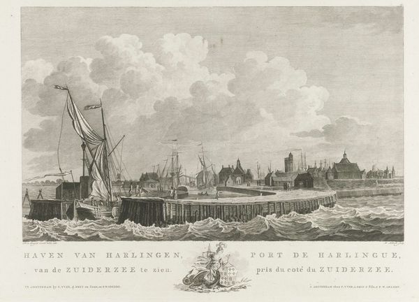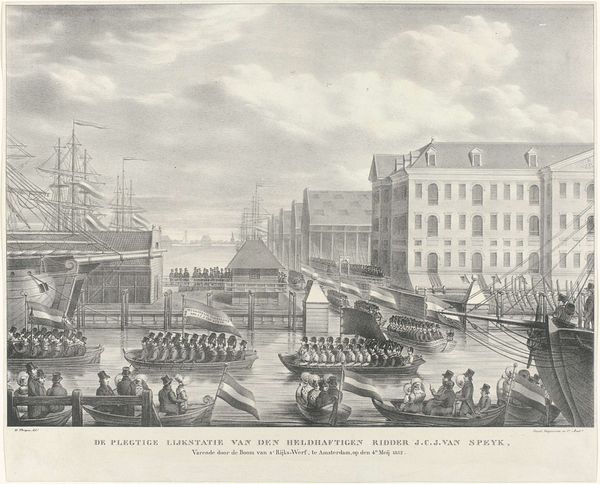 Curator: This print, tentatively dated between 1710 and 1766, is entitled "Gezicht op 's Lands Zeemagazijn (Admiraliteitsmagazijn) te Amsterdam," and it is held in the Rijksmuseum. Editor: It possesses a starkly calm beauty, wouldn't you agree? The mirrored reflections, precise lines – there's an almost stoic stillness to this port scene. Curator: Indeed. Consider how the engraver has achieved such subtle gradations with what is fundamentally a binary medium. Look at the intricate rendering of light and shadow, creating an almost tangible depth despite the monochromatic palette. The composition, while seemingly straightforward, balances the monumental architecture with the dynamic activity on the water. Editor: Those ships... they loom so large, don't they? Almost threatening. One can sense the pulse of Amsterdam as a global trade nexus, the wooden hulks symbolizing voyages and ventures both daring and dangerous, perhaps evoking images of both exploration and colonial exploits. They dwarf those small human figures almost imperceptibly gliding across the water. Curator: Exactly. The spatial relationships constructed here provide a visual syntax, communicating Amsterdam's strategic and economic power. The architectural form of the Zeemagazijn, solid and unwavering, exemplifies rational, humanist ideologies embedded in early Enlightenment sensibilities, whilst the shipbuilding area reminds of human endeavour. Editor: The flags above the building, mere blurs on the paper, hint at allegiances and authorities... And it strikes me, the visual prominence given to both architecture and seafaring vessels points toward an intense sense of civic pride interwoven with that of commercial power. Amsterdam seems to project her status on this engraving! Curator: Precisely! Moreover, look at the formal relationship established between line and plane. Note how lines delineate both form and surface, while also creating an evocative tension and harmony across the visual field. It achieves that rare harmony emblematic of the period! Editor: This image speaks to us of Amsterdam as more than just a location. The symbols presented evoke a complex story. So, despite the technical and representational qualities apparent in the print itself, we also unveil how the themes present contribute layers of symbolic meanings related to commerce and exploration. Curator: A fascinating convergence, certainly. This exercise unveils not only Amsterdam's past but reminds one to think carefully about what might be deemed of artistic or cultural import, as we look ahead. Editor: Agreed! In that way, we can come to recognise how this artwork captures not just a scene, but enduring notions concerning trade, power, ambition and visual symbolism that stay relevant to modern eyes.