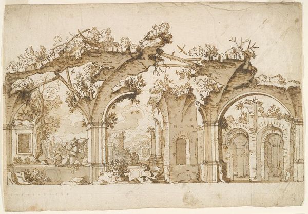Editor: This is Giovanni Paolo Panini's "A Baroque Arcade," a pen and brown ink drawing. The arcade feels almost like a stage set. What symbolic weight might these architectural forms have carried for Panini? Curator: The arcade, a recurring motif, symbolizes passage and transition. In the Baroque period, architecture often evoked power and grandeur. The repetition of arches, do you notice how they create a sense of rhythmic progression? Editor: Yes, and they seem to lead somewhere, but we can’t see the destination. Curator: Precisely. Perhaps it represents the aspirations of the era or the illusion of limitless possibility. Considering Rome's history, do you think these forms evoke a sense of cultural memory? Editor: That makes me think about the Roman Empire and its impact on art. I see so much more in this drawing now. Curator: Indeed, a single image holds layers of symbolic meaning.