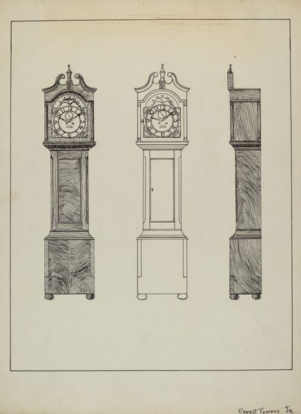 Geoffrey Holt made this 'Grandfather's Clock' drawing with what looks like watercolor or maybe gouache, and there is a real interest in the surface, the making of the clock itself as a kind of process. There's a lot of transparency here, a layering of thin washes to build up the wood grain. The way Holt uses the gold detailing feels almost like a secret language. It highlights the connection points, the hinges, and the finials, making them pop against the muted browns. Notice the wood grain effect which flows through both parts of the clock, tying them together in a dance of natural forms. It reminds me a bit of some of Charles Demuth's architectural drawings. But where Demuth is all about precision, Holt seems more interested in the character, the spirit of the thing. It is like Holt is less interested in accuracy and more in capturing a feeling, maybe even a memory. Art is so often a kind of conversation, a back-and-forth across time.