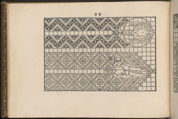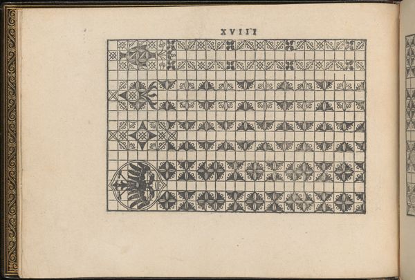 Curator: Looking at this, I'm struck by the patience needed to execute such a detailed design. It's almost hypnotic. Editor: Indeed! What we're observing is a page from Giovanni Ostaus's "La Vera Perfettione del Disegno di varie sorti di recami," specifically page 9 recto. Dating back to 1567, this print utilizes intaglio to depict intricate embroidery patterns. Curator: Embroidery patterns, you say? So this wasn't meant to be hung on a wall, but rather to inspire… stitches? I can almost feel the pricking of a needle on fabric. There’s a sort of muted vibrancy, it feels both old and utterly present. Editor: Exactly! Think about the material realities of 16th-century textiles: the production of linen, silk, the dyes derived from plants and insects, the skilled labor required. This print embodies the convergence of design and artisanal work. It highlights the "pattern and decoration" movement too. It bridges the gap between fine art and the “decorative” or applied arts, if we even accept that divide. Curator: The geometry almost gives it an architectural feel, doesn't it? Rows of tiny rooms or gardens seen from above, little universes stacked neatly. And the thought that someone would then translate this precise design, pixel by pixel, with thread… Editor: The act of reproduction—from design to stitch—creates its own social context. This image stands as a blueprint for artisans; consider the circulation of design ideas, the transmission of skills within workshops, the rise of pattern books driven by marketplace dynamics. Curator: It brings up so many lovely ideas... the touch of thread, how this imagery might soften with age… it also carries the potential of something greater, of new stories taking root within its design. What an elegant whisper from the past! Editor: Ostaus’s “perfettione” certainly prompts us to ponder art and craft connections across centuries and media! A fine stopping point.