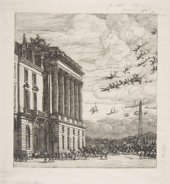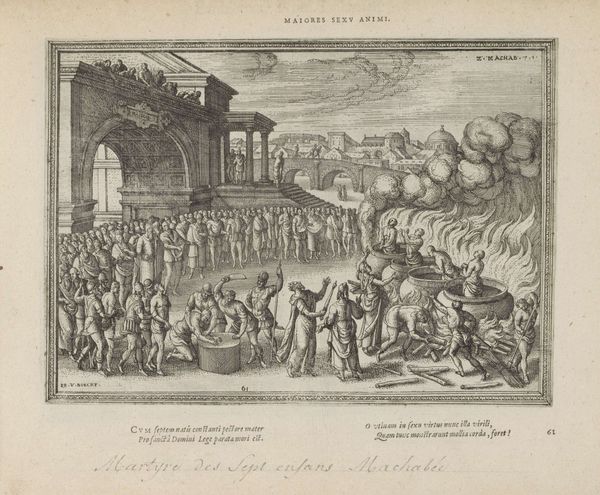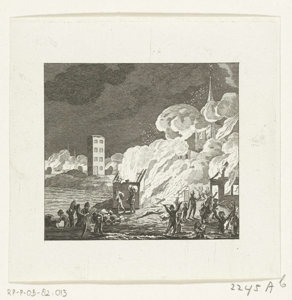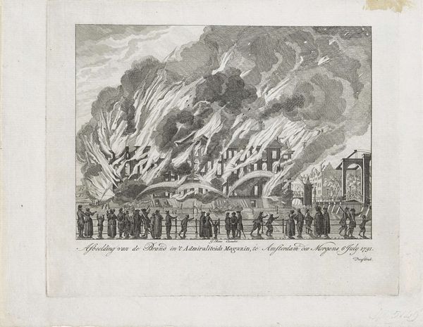 Editor: So, here we have "Brand in de Kapelkerk te Alkmaar, 1760" by Simon Fokke, a rather dramatic scene rendered in engraving. I'm immediately struck by the contrast between the meticulous detail of the architecture and the chaotic depiction of the fire and the gathering crowd. What draws your attention in this print? Curator: Well, the burning Kapelkerk is indeed quite captivating. But let's consider Fokke's means of production: an engraving made for mass consumption. Note the layers of labor – from the paper-making, to the engraver, the printing press operators, to those distributing the prints. All contributing to a consumable product depicting disaster. The fire itself, too, consumed matter to create a spectacle, immortalized for sale in printed form. Do you think the print romanticizes this historical event? Editor: I suppose so! I mean, there is a degree of… artistic license… maybe. It is definitely a commercial enterprise though. It's interesting how this medium—the print—sort of transforms a singular, destructive event into something reproducible, and therefore almost ordinary. Like a news report almost. Curator: Exactly. Fokke used very common materials and basic methods, a sharp contrast with our assumptions about the "high art" practices and cultural capital. We can look at how he utilized line and tone within a rigorous process, for production across a wide consumer base. To whom do you think these images were marketed? Editor: Well, probably people interested in local events, perhaps even people who were there! Middle-class folks buying it to remember, discuss... and, in a morbid way, own a piece of the spectacle? Curator: Precisely. Think, too, about how each stage of production depended on materials and the bodies performing the labour. Also the means by which it was sold - how it changed hands, how the subject has entered into the art canon... the implications are considerable. Editor: That really puts the image in a new light, shifting the focus from just the depiction of the fire to the social and economic networks surrounding its creation and consumption. I never really considered this as a commodified disaster. Curator: Focusing on materiality really shows us the labour, systems, and exchanges underpinning something that, at first glance, might seem purely aesthetic or historical.
