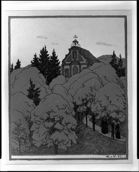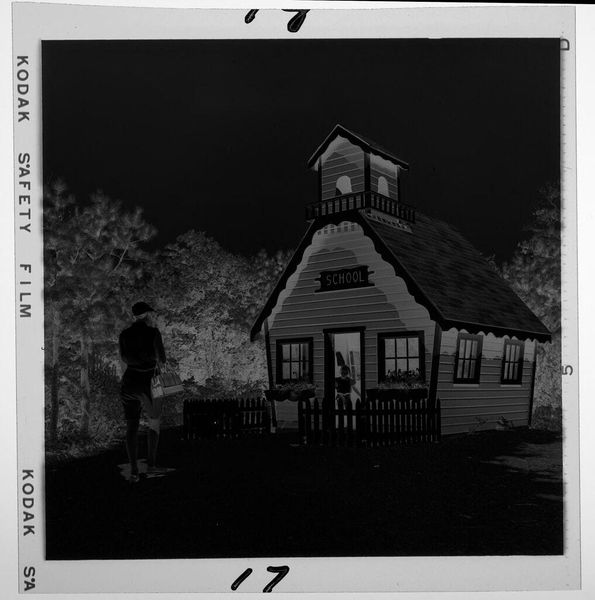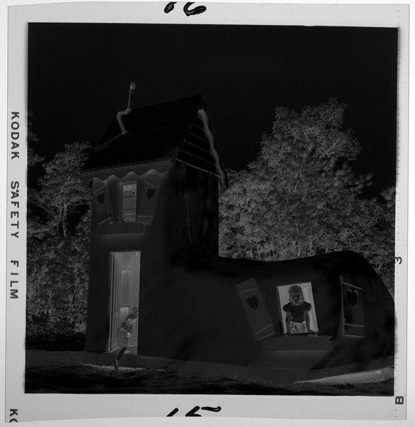 Editor: This is an untitled photograph by Jack Gould, showing a small castle with people walking by. It's quite dark, almost dreamlike. What social commentary do you think Gould might be making here? Curator: This image invites us to consider the manufactured nature of aspiration. The castle, a symbol of power and fairytale promises, is revealed as a facade against the backdrop of everyday life. Who gets access to the "fairy tale" and at what cost? Editor: So, it's about the illusion of upward mobility? Curator: Precisely. The figures walking past become complicit in the perpetuation of this illusion. Do they aspire to the castle, or are they merely extras in its performance? It makes you wonder about the artist's intended message. Editor: I see. It makes me think about how we stage our lives. Thank you.