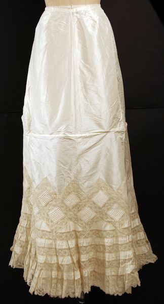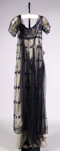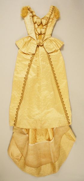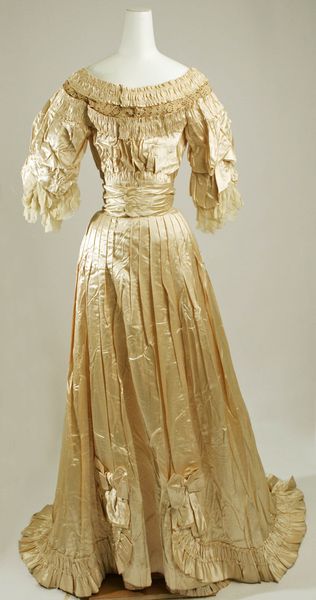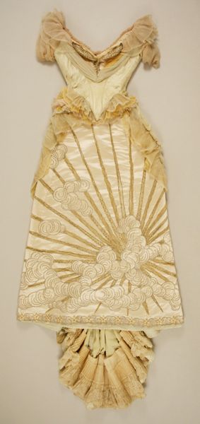 This wedding dress, crafted by Raudnitz and Co. alongside Huet and Chéruit, whispers tales of unions and aspirations through its delicate lace. The floral motifs, emblems of fertility and blossoming, are woven intricately into its fabric, resonating with age-old desires for prosperity and continuity. These floral patterns are not merely decorative; they echo through art history, appearing in Renaissance tapestries and Victorian embroidery, each time carrying hopes for new beginnings. Even in ancient Roman frescoes, we find floral garlands adorning spaces, celebrating life's cyclical nature. The colour white, a symbol of purity, has also undergone transformations. Though now synonymous with bridal innocence, its earlier associations included wealth and status, reflecting the wearer's ability to afford undyed fabrics. This dress engages with our deepest subconscious understanding of love and commitment, echoing cultural memories that shape our understanding of marriage. The motifs, the colour, and the form contribute to an emotional experience, engaging us in a dialogue with history. The wheel turns, and the past lives within this dress.