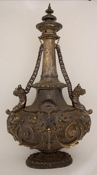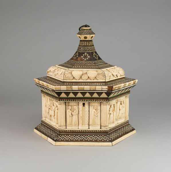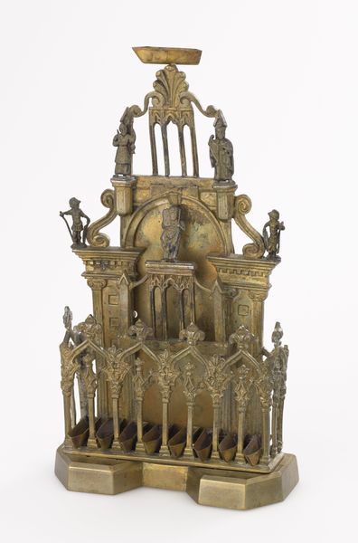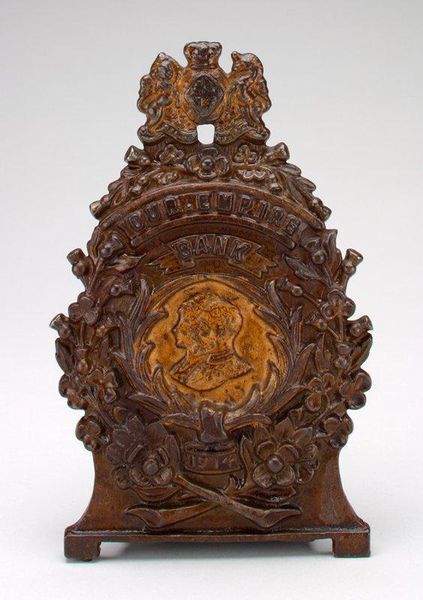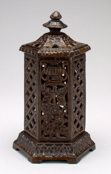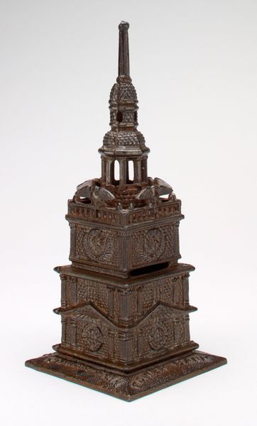 Curator: This curious object is a semi-mechanical bank in the shape of Independence Hall Tower. It was crafted by the Enterprise Manufacturing Company in 1875. Editor: It's weighty, somber. I picture it sitting on some bank manager’s ornate desk back in the day—a tiny sentinel of savings. It evokes a sternness, a sense of fiscal responsibility, don't you think? Curator: Yes, its architectural structure exudes authority. Note the strict verticality, the repetitive geometric forms. Each tier is a self-contained unit, contributing to an overall impression of stability and order. Editor: And yet, miniature! There's a playful tension there. The seriousness of civic architecture miniaturized into something collectible, a child’s bank even. What’s the materiality—metal, looks like? Curator: Indeed, metal—likely cast iron, a durable choice. Its surfaces are weathered, but the essential forms retain clarity, exhibiting principles of symmetry and proportion that were important during that era. The rust almost feels patriotic somehow. Editor: Patina of liberty! I wonder what inspired the artist to create this semi-mechanical bank from found objects? Curator: The "semi-mechanical" element is intriguing. We must remember the Centennial Exhibition of 1876 loomed, and the USA would be thrust into international view for technology, so there are complex historical connotations imbedded in the form here. Editor: Ah, so a hopeful time, then, tempered perhaps by the economic realities symbolized by the act of saving. It bridges commerce and civics. It's pretty inventive. Curator: It serves as both sculpture and assemblage, a functional object imbued with symbolic value. It stands as a powerful artifact. Editor: It's history compressed. Curator: Precisely, and through its materials, forms, and context, invites sustained scrutiny. Editor: Absolutely. And I guess that makes it an artwork, if people keep looking at it long enough.