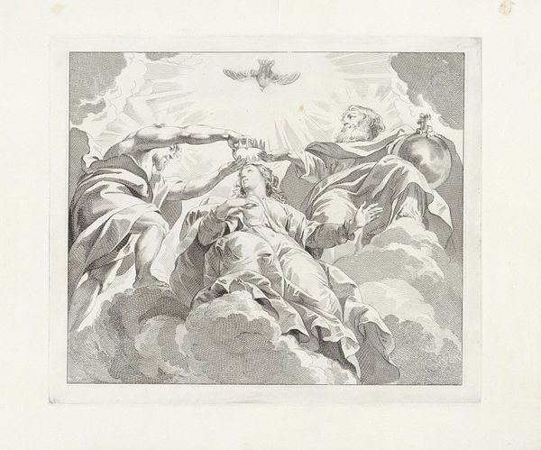 Jacob de Wit created this etching called "The Coronation of Mary". The image shows the Virgin Mary being crowned as Queen of Heaven by God the Father and God the Son, while the Holy Spirit descends above. De Wit was a leading figure in the Dutch Golden Age. His work reflects the religious and cultural values of his time. In the 17th and 18th centuries, the Catholic Church was a major patron of the arts, commissioning works that reinforced its doctrines and authority. The coronation of Mary was a popular theme, symbolizing her unique role in salvation history and her intercession for believers. This etching would have been a way of visualizing religious concepts and devotional practices. Art historians might consult theological treatises, devotional literature, and the records of religious institutions to understand the meaning and function of such images in their original context. The meaning of art is always contingent on its social and institutional context.