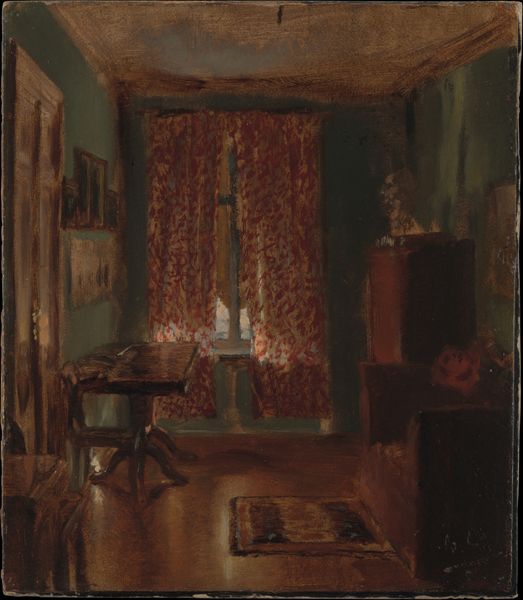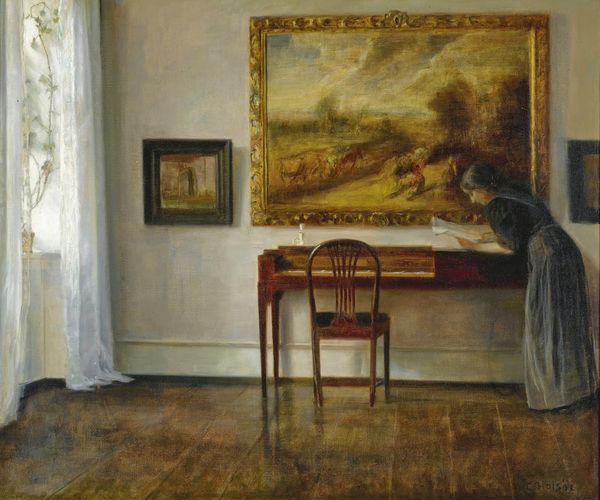 Carl Holsøe painted this interior scene with his wife using oil on canvas, a venerable medium for domestic scenes like this. The way Holsøe has built up the paint is intriguing. It’s not showy, but rather restrained, reflecting the quietude of the scene. Notice how the subtle variations in tone and texture bring the room to life. The smooth, almost glazed finish on the furniture contrasts with the softer, more diffuse rendering of the curtains and the figure of Emilie. It’s a study in subdued contrasts. The application of paint here is interesting, because it reflects a certain degree of middle-class comfort, but also the labor that sustained it. The very act of painting was a luxury, but one that here is turned to the depiction of everyday life. Ultimately, Holsøe’s painting invites us to consider the social context in which both art and domestic life are produced, blurring the lines between the act of creation and the world it represents.