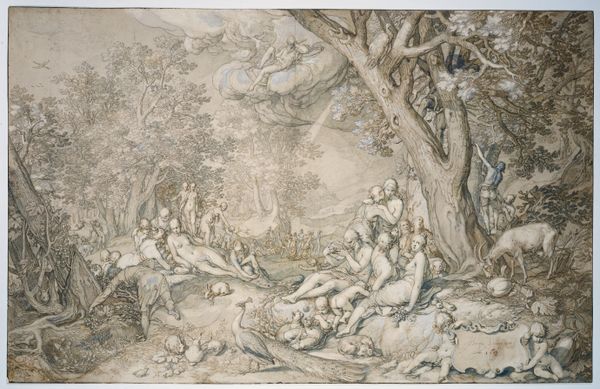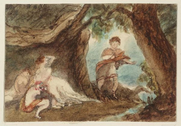 Curator: I am swept away by this, dare I say, absurd yet strangely beautiful watercolour illustration. Leopold von Bode created "Die Elfenkönigin Titania bekränzt den neben ihr sitzenden, eselköpfigen Nick Bottom" around 1883. It's just delightful. Editor: Yes, I’d have to agree – my immediate reaction is one of amused bewilderment. The ethereal, pastel shades lend a dreamlike quality, almost as though glimpsed from the corner of one’s eye, while that donkey’s head adds an element of surreal absurdity. Curator: Exactly! It's Titania, the fairy queen from Shakespeare's "A Midsummer Night's Dream," and she’s adorning the donkey-headed Nick Bottom with flowers. In Shakespeare’s play, she's under a spell, of course, and completely smitten with him, no matter how ridiculous he appears. Editor: Right, it is that delicious scene from Shakespeare! Von Bode perfectly captures that bizarre, topsy-turvy love. He also cleverly uses light and shadow here to enhance the feeling of enchantment. Those pale colors contribute so much to the work. There's a psychological aspect, of course; maybe it speaks to the blinding power of love, or the ways our desires can distort our perceptions. Curator: I couldn’t have said it better myself. Look at the way the figures are placed within the forest. Von Bode has given it this ethereal, dreamy quality, this isn't the familiar woods near your home; it's someplace stranger. It highlights the difference between Titania’s enchanted perception and our mundane reality. I am intrigued that the artist chose to represent the scene in a gouache, chalk, and watercolour illustration... there is an inherent whimsical and spontaneous nature that perhaps leans into the surreality of the moment. Editor: And I notice how the fairies, rendered with such delicate, almost porcelain features, act as visual counterpoints to Bottom’s brutish head. He becomes a poignant symbol of contrast – between the beautiful and the beastly, the rational and the absurd. I also love that he's still trying to converse normally as he gestures outwards with his right hand as if not even he can understand why he is sitting here with an elf queen. Curator: In conclusion, Von Bode reminds us to surrender to the absurd and to embrace the dream-like qualities of art – as well as to seek humour even in unexpected juxtapositions! Editor: Nicely put! Von Bode's ability to intertwine cultural symbols, humor, and romanticism produces, if I may say, an unsettling and delightful spectacle about love’s enduring enigma.