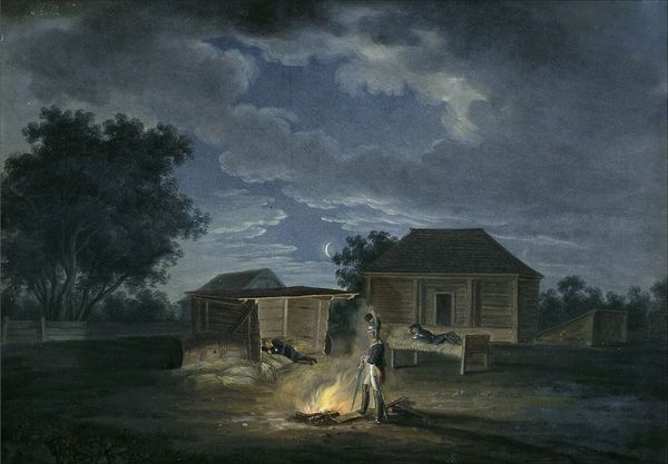 Albrecht Adam painted “Daŭhinaŭ. 17 July 1812” without indicating the medium used, though the effect is like watercolour. It gives us a fascinating, seemingly objective glimpse into a moment during Napoleon’s campaign into Russia. The image presents a scene from the ground, a view of a humble wooden building used by the French army, and this perspective is crucial. Adam was embedded with the French forces, yet the painting avoids glorifying war. Instead, it focuses on the everyday reality of military life. The building itself, probably a temporary structure, suggests the transient nature of the occupation. The buildings, the unpaved roads, and the ordinary people going about their business remind us that war isn't just about battles and strategy; it’s about the impact on the social fabric. To truly understand this work, we need to consider the social conditions that shape artistic production. Further research, into the artist’s biography, the patronage system of the time, and the culture of military art, could reveal more about the painting's purpose and reception.
