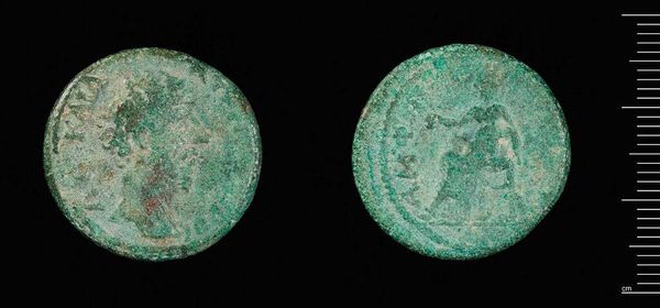 Curator: This coin of Amphipolis, bearing the likeness of Faustina II, really embodies the political power accessible to women in the Roman Empire. Editor: There's something striking about the texture; the verdigris gives the coin a worn, tactile quality. Curator: Absolutely, these objects offer insight into the lives of powerful women. Faustina's image on currency served as a form of propaganda. It connected her to the everyday lives of people across the empire. Editor: The composition directs the eye to her profile, regal and serene; even in this state, the craftsmanship is evident. Curator: Her position as empress gave her cultural influence, but the coin reminds us that this power was inextricably linked to her husband's authority and the overall patriarchal framework. Editor: I'm left contemplating how such a small object could carry such weight, both literally and figuratively. Curator: Precisely. It serves as a reminder of the complex relationship between gender, power, and representation in antiquity.
