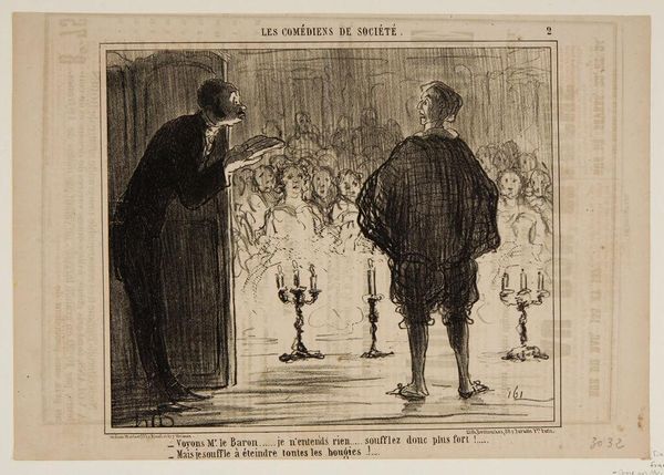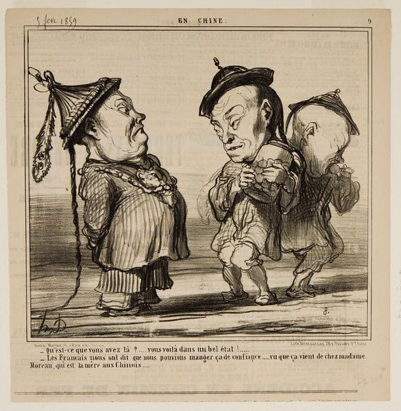 Editor: So, this lithograph is by Honoré Daumier. It doesn’t have a date, but the title translates to, "To say that now we have to give the correct weight…it's revolting!" The figures look so indignant! What do you see in it? Curator: Oh, Daumier, always with the pulse of Parisian life! I see a biting commentary on societal hypocrisy. His caricatures weren’t just funny; they were jabs at corruption and the absurdity of the status quo. Look at their exaggerated features, the outrage practically dripping off of them! Do you think he sympathizes with them, or mocks their self-importance? Editor: I think it’s a little bit of both! He captures their outrage, but their inflated expressions suggest he’s also poking fun. Curator: Precisely! And that, my friend, is the genius of Daumier. A mirror reflecting society's flaws with a wink and a nudge.