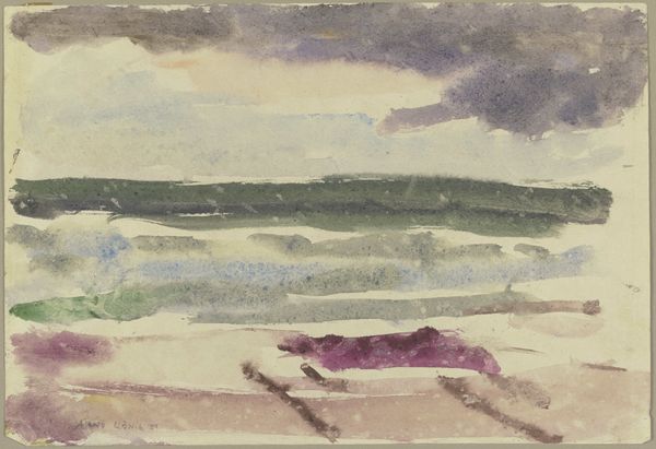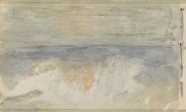 Curator: This is James Abbott McNeill Whistler’s, *The Ocean Wave*, created around 1883 or 1884 using watercolor on paper. What’s your immediate reaction? Editor: Hmmm... A wisp of a memory. A watercolor that feels like a sigh, doesn’t it? Ephemeral. Muted colors, sort of washing over you. Is this a melancholic beach? Curator: Precisely, and it's interesting that you say "memory." Whistler was deeply influenced by Japonisme and sought to capture a feeling or fleeting impression rather than a detailed representation. Remember, he was famously invested in "art for art’s sake." Editor: Yes! And that gets right to the cultural core of what Whistler was doing; pushing back against Victorian narrative painting, which so often delivered moralizing stories for public edification. Here, he gives us the personal, the intuitive. No grand statement here. Curator: Whistler moved between London and coastal towns during this period, seeking out these marine subjects. Note the subdued palette of blues, grays, and creams, very similar to many of his Thames river scenes, echoing through seascapes. Editor: And beautifully balanced, too! It almost feels abstract at first glance. Three layers of tones, each slightly varied – the sandy foreground, the slightly turbulent sea, and the hazy, amorphous sky. I wonder, do you think that his famous aversion to discussing or explaining his work might relate to this feeling? It feels deeply felt, not rationally conceived. Curator: Absolutely. He would present these landscapes, particularly his "nocturnes," almost as musical compositions. What resonates with us, decades later, is this incredibly evocative scene of solitude and perhaps introspection. It captures, I think, something deeply human in our relationship with nature. Editor: A delicate balance. He lets us bring our own story to it. Not something the Royal Academy would have understood! This is not about visual perfection; it's about... capturing a breath. Curator: Precisely, which makes this, for me, an enduring and evocative work, shifting painting away from mere imitation of reality, toward expression of inner experience. Editor: I’ll certainly pause next time to feel that space instead of overthinking it.