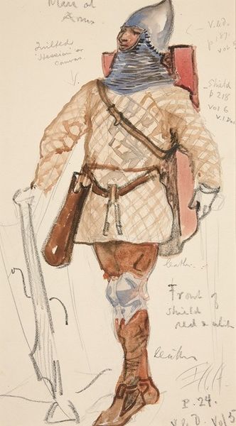 Curator: Immediately, I’m drawn to the green of his overcoat – a vibrant slash of color against the monochrome of the rest of the sketch. There’s something theatrical about it. Editor: Exactly! What we're looking at is a costume design by Edwin Austin Abbey, titled "Keeper of Prison," a sketch created for Henry Irving's ambitious but ultimately unrealized 1898 production of Richard II. Curator: Unfulfilled projects are always fascinating. Costume design provides such insight into theatrical production; it’s essentially textile-based character building, using color, silhouette and surface to evoke emotion and story. You’ve got to wonder what raw materials he was considering and the impact on stage of textures, volume and weight. Editor: The history of Irving’s productions is interesting in itself. He aimed for historical accuracy, and his elaborate staging was incredibly influential, setting a new standard for spectacle. It speaks to the broader Victorian interest in the medieval past, and the construction of English national identity. Think about the political function of such revivals and what narratives were promoted through them. Curator: And what was rejected? There is real materiality to consider here with what’s absent in costume sketches such as textiles, notions, and the techniques needed to hold things together and support them. One can almost see the exploitation that goes into making that level of production even with a cursory glance, don't you think? Editor: Absolutely. Costume sketches also functioned as promotional material, circulating within elite circles and influencing popular perceptions. But they were also used by textile factories, workshops and other trades that benefitted from a production like this, a constant, lucrative process of art, labor and dissemination. It created work, opportunity. Curator: Very true, although a lot of the actual laborers and producers that gave this production life are rarely if ever given the spotlight within social narratives surrounding Victorian culture. But despite that it gives new insight into seeing the costume through the context of the world that consumes its symbolism. Editor: A reminder that a garment on stage or page holds more than meets the eye. It represents the culmination of artistic vision and socio-political desires. Thank you for that materialist insight. Curator: Indeed, this glimpse behind the scenes allows us to imagine what might have been, while prompting critical thinking around those involved in its making and reception.