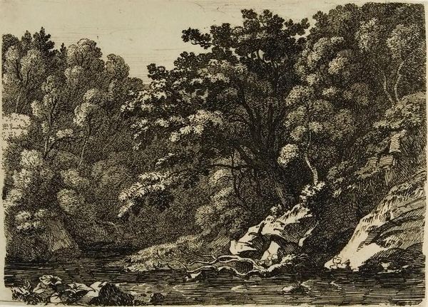 Curator: Karel Dujardin’s etching, "The Packer with Two Donkeys," made in 1660, captures a moment of everyday life within a specific socio-economic context. Its delicate lines and carefully constructed composition give insight into 17th century Dutch society. Editor: It feels so pastoral, almost idealized, despite being so grounded. I am particularly drawn to the density of the lines used to form the old tree versus the sparse and gentle application to create the falls in the background. The contrast almost places you in this moment with the two donkeys and the resting man. Curator: I'm particularly interested in unpacking this seemingly simple pastoral scene. Think about who had the leisure to commission or purchase such a work, who owned and profited from the labor of these "packers"? It's about examining class structures embedded within representations of labor. Editor: Absolutely. It's fascinating to consider the actual labor involved in producing the print itself. The materials – the copper plate, the inks, the paper – and the craftsman hours speak to a different kind of labor. I think that connection with the making of things should not be forgotten. Curator: The presence of the donkeys prompts questions about how non-human animals were essential in this social setting. It offers avenues for intersectional discourse surrounding ethics and marginalized subjects in a broader frame. How labor is mapped across all beings represented. Editor: Precisely. Etching, as a process, also involves a kind of collaboration. The artist, the materials, even chance plays a part, allowing acid to eat away at the plate. How the artist harnessed such methods and what those images conveyed must always include how they came to exist in physical form. Curator: The interplay of light and shadow further enhances this, presenting labor as picturesque while overlooking realities. By challenging this picture, we unearth how art can unintentionally reproduce dominant cultural ideologies about servitude and work, and perhaps encourage change. Editor: Agreed. Focusing on the production, we get a clearer view of both its place in that time and space. In its material form, art connects the world across spans of time by connecting with what that object does to those who still interact with it now. Curator: Yes, and perhaps also offer paths for present action, now enlightened about what may or may not be equitable in those historical patterns. Editor: Right. The dialogue between historical conditions, materials, production, and ideology truly adds layers to our experience.