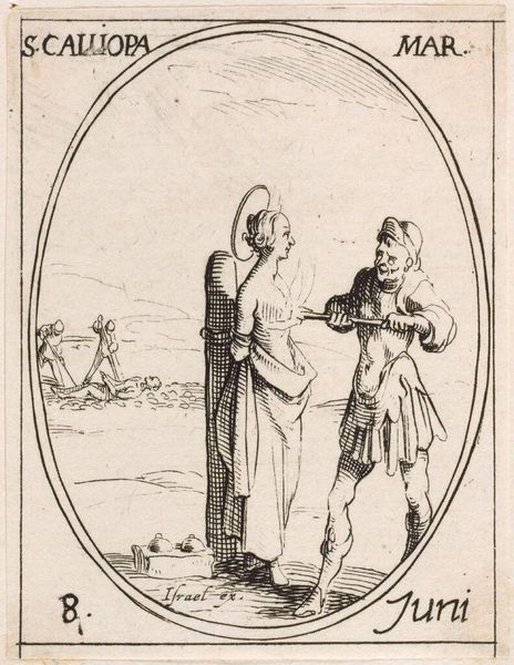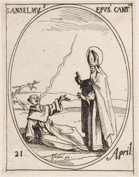 Curator: This is Jacques Callot's "Saint Joseph the Just," a small but evocative engraving from the early 17th century. Editor: It feels like a fleeting moment, almost a dream. The lines are so delicate, yet there’s a gravity to Joseph's gaze as he accepts the goblet. Curator: Indeed. Callot, deeply influenced by the Counter-Reformation, often used prints like these to disseminate Catholic imagery and reinforce social hierarchies. Note how Joseph's piety is contrasted with the servile gesture of the offering. Editor: Right, there's this undercurrent of power, of divine right, even in this intimate scene. It makes you wonder about the artist's own beliefs, doesn't it? Curator: Absolutely. Callot was working in a time of immense religious and political upheaval, which must have shaped his perspective. Editor: It's humbling to think about the stories and struggles compressed into this little oval. Thanks, it really makes you think.