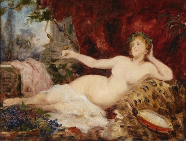 Léon Bazile Perrault painted 'The Bather', using oil on canvas. This artwork immediately strikes one with its composition: the body of a reclining nude set against a dark forest backdrop, illuminated by a soft, natural light. The sensuous curves of the figure are emphasized by the flowing red cloth beneath her. Perrault's interplay between light and shadow lends the scene a dramatic yet intimate atmosphere. The female form is idealized, almost sculptural in its rendering, reminiscent of classical forms. Her serene repose contrasts with the wildness of the surrounding nature, creating a tension between civilization and the natural world. The choice of a nude bather in a woodland setting draws on established art historical tropes but adds a layer of complexity through its composition and execution. Perrault’s painting not only captures a moment of sensual beauty, but also engages with broader narratives about femininity, nature, and the gaze.