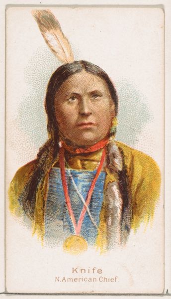 Curator: Ah, here we have "Little Brave, North American Chief," from the Savage and Semi-Barbarous Chiefs and Rulers series, issued in 1888 by Wm. S. Kimball & Co. It's a colored pencil drawing, reproduced as a print. Editor: "Little Brave"? He doesn't look all that little! There's such a quiet dignity in his eyes. Kind of makes you wonder what stories he holds inside. Curator: Well, the title reflects the pervasive societal views of the time. These trading cards were wildly popular, part of a larger visual culture that exoticized and often misrepresented indigenous people. Editor: That red feather pops, doesn't it? Such a small detail, but it just elevates everything. There's something haunting in his gaze, as if he is silently watching history unfold. Curator: Absolutely. The portraits in this series aimed for realism, but through a distinctly colonial lens. The goal was not genuine representation but categorization. Note the flattening of cultural differences. Editor: True. It makes you wonder what the encounter was like. Did he know his portrait would end up on a trading card? Did he agree with that caption beneath, "North American Chief?" The absurdity of it! I imagine there's so much lost in translation. Curator: Exactly. Understanding the social context is critical. These cards played a significant role in shaping public opinion and justifying expansionist policies. Art rarely exists in a vacuum. Editor: It makes you consider the power dynamics behind these depictions, right? The imbalance of power between artist and sitter. It all sort of lingers like the smoke of a dying fire, doesn’t it? Curator: Indeed. These images acted as potent symbols within the developing national identity. Considering the impact they had and still have helps us think critically about the way marginalized people are viewed and represented in mainstream culture. Editor: Seeing the work reminds me that even with good intentions, the story can change as it filters down through generations. This experience has made me more mindful of all that is unseen, what questions remain that cannot be spoken.