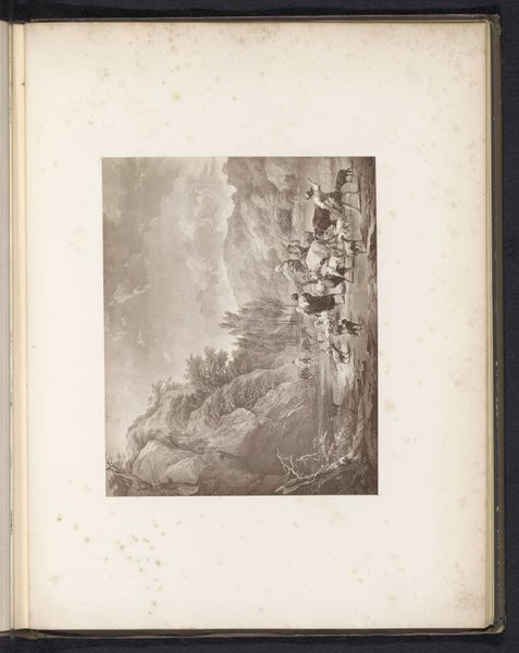 Curator: We’re standing before “Schaapherder,” a drawing, etching and graphite work by Paulus Lauters, dating to around 1830, currently residing here at the Rijksmuseum. Editor: It’s rather melancholic, isn’t it? The misty landscape, the drooping posture of the sheep... it evokes a feeling of quiet solitude. Curator: Let's delve into that a little further; look at the evident processes and techniques that would have been implemented by Lauters. Consider the physical effort and labor behind producing such a delicate drawing using a combined medium of etching and graphite on paper at that particular moment in time. Think about how each strike with his etching tool helped give rise to the sheep, shepherd, and misty setting we see. Editor: True, and the choice of sheep themselves! Throughout art history, sheep are constantly seen in this role as representing innocence, sacrifice, pastoral harmony… here they reinforce the romantic ideal of rural simplicity, reflecting a yearning for a simpler, perhaps idealized past. Note the interesting positioning of the sheep versus the goats. What visual connection can be made? Curator: And where was this pastoral idyll manufactured and consumed? Was it made to appeal to a rising urban bourgeoisie, hungry for imagery of a romanticized rural existence so contrary to the rise of industrialized labour? It’s essential to reflect on this and its wider circulation and distribution at the time. It prompts thoughts regarding artistic markets, audience reception and class perceptions. Editor: You're right. I find myself also pondering the shepherd – almost hidden in the landscape. He's less of a focal point and more an element integrated within the broader symbolic picture. Is this possibly a statement on humanity's place within the natural world, dwarfed by forces beyond our control? What connections can be made in that light between the image of the goat/ram on the top right of the art piece and that of the single shepherd in the middle? Curator: I see that now, the image of humanity being dwarfed! Lauters gives us so much to work with here in the physical construction of the art! This is not just about aesthetics but how meaning is manufactured by means of material practice and distributed culturally through mediums of etchings, drawing and graphite. The art here has truly delivered a profound discourse on historical values and cultural construction within Romantic era production. Editor: Indeed. The interplay of technique and symbolism, with Lauters choice of image creates a very complex visual narrative which has evolved from materiality into meaningful story that persists even today. Curator: Absolutely. Examining Lauters artwork in "Schaapherder" allows us a fascinating glimpse into material construction techniques during his practice! Editor: Yes, and reflecting on it from an iconographic perspective helps unveil these symbolic weights.