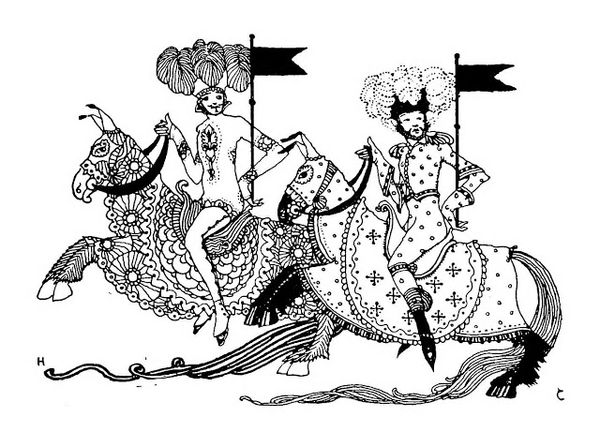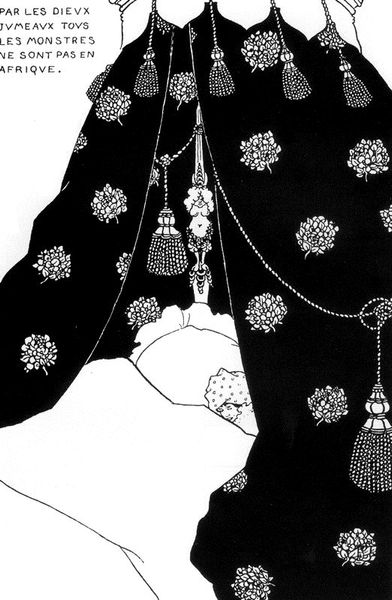 Harry Clarke created this drawing, "The Year's at the Spring" using ink and paper. Here, a woman is perched atop of what appears to be a stack of pumpkins, or bulbous flower buds. The image is striking for its contrast in textures and lines. The woman herself is drawn with sharp, clean lines that delineate her dress and figure, while the pumpkins are rendered with dense, chaotic lines, particularly at their base. Notice how Clarke uses contrasting patterns to define each form, creating a visual hierarchy. The woman, with her crisp lines and controlled form, stands out against the more organic and almost frenetic rendering of the pumpkins. This contrast could reflect Clarke's interest in the interplay between order and chaos, control and freedom. The woman's poised figure over this untamed base suggests a negotiation between human intention and the natural world. Consider also, how the very act of drawing, with its deliberate lines and controlled application of ink, mirrors this theme of imposing order onto a blank canvas.