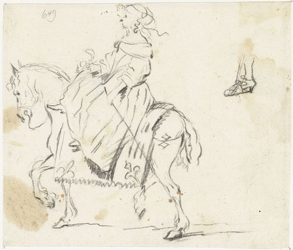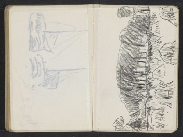 Editor: Here we have an untitled drawing by Fritz Boehle, "Dog and figures," sketched in graphite and pencil on paper, seemingly from the 19th century. The left side depicts figures and the right, a canine head. I’m struck by the stark contrast between the defined figures and the barely-there rendering of the dog. How do you interpret this compositional choice? Curator: Let us consider the formal aspects first. The work presents a dichotomy – sharply delineated forms against amorphous ones. The figures are constructed with strong, confident lines, creating a sense of weight and volume, whereas the dog is mere suggestion, an ethereal presence achieved through light, sketchy marks. This visual opposition forces a certain reading. Editor: You mean, beyond just an unfinished sketch? Curator: Precisely. Notice how the structural integrity of the figures contrasts against the gestural fluidity of the dog. One could suggest a symbolic weight to the human form versus a kind of transient or even immaterial nature represented by the dog. Look how the repeated verticals of the figures' clothing pull the eye downward. What do you see happening with the lines of the dog's form? Editor: They feel much softer, as if fading into the background. They emphasize the curve of its head and suggest motion rather than solidity. Curator: Exactly. The contrast is key. The sharp, deliberate lines defining the figures create stability and structure, while the vague and ephemeral rendering of the dog invites a different reading, possibly about ideas that escape concrete definition. The choice of medium, graphite and pencil on paper, enhances these formal properties with their inherent textural variations. Editor: It’s amazing how the technique itself drives so much of the meaning. Thank you. I never considered line quality making such a substantial statement on its own. Curator: Indeed, by focusing on the formal elements, we unveil layered intentions within the composition. The dialogue between these shapes reveals more than meets the eye initially.