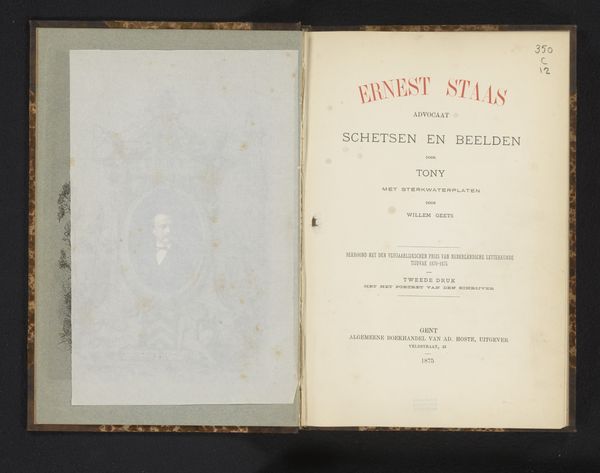 Curator: Here we have an etching dating to 1874, "Ernest Staas, advocaat : schetsen en beelden", which translates to "Ernest Staas, lawyer: sketches and images," a collaborative effort by Tony Bermann and Willem Geets. It presents as the opening of an illustrated book. Editor: My immediate sense is of delicacy. The print is light, almost ghostly, giving the impression of something quite refined, though formal. The portrait in that decorative surround, it all points to status, doesn't it? Curator: It does. Let’s think about etching as a medium in this social context. This was an age where printmaking allowed for the democratization of portraiture. A book such as this signals Staas's standing. And these illustrations made in "sterkwaterplaten," with strong water plates, as it's described, suggests careful, controlled craftsmanship. It wasn’t simply churning out images; it’s a more considered process. Editor: Indeed. Etching traditionally possesses an intellectual appeal; it is the art of incisive lines biting into metal, demanding skill. Looking at the ornate frame surrounding the portrait, one can trace the classical influences but observe its integration into something distinctly bourgeois, a subtle claim to elevated culture. It's laden with symbolic weight. What stories does this layering tell about Staas, the man? Curator: The details in that frame, particularly the cherubs and what appear to be allegorical figures at the base, definitely enhance that sense of gravitas and allude to qualities associated with justice and civic virtue. But notice how the ink seems uneven in places. That element of the unpredictable – a quirk of the etching process itself – offers an interesting counterpoint to all the deliberate social signaling. The act of production is quite visible. Editor: Absolutely, it invites questions regarding value. Is it primarily a book for legal colleagues or potential clients, a sophisticated calling card of sorts? The aesthetic speaks volumes, linking law, art, and bourgeois respectability. The title itself suggests he is viewed in a similar manner: part lawyer, part muse. Curator: A blend of the practical and the ideal… fascinating. Ultimately, it shows how art objects embody and participate in the social and economic life of their time. Editor: Precisely. The layers of symbolic meaning, from classical imagery to etching process, creates an object rich with historical context and aspiration.