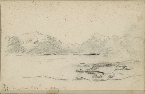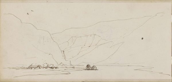 Curator: This sketch evokes a feeling of stark isolation. Editor: Indeed. We're looking at "View of the Coastline of Nova Zembla," a pencil drawing created around 1880 by Louis Apol, presently held at the Rijksmuseum. The sketch depicts a desolate coastal landscape. I see the immediate rawness of the pencil strokes; Apol captures the skeletal geography through minimalist mark making, which communicates to the viewer an impression of emptiness. Curator: For me, it's intriguing to consider this piece within the context of 19th-century artistic production. Artists were often implicated in colonial narratives, and landscape art served to document and often implicitly justify expansion and resource extraction. How does this depiction of Nova Zembla—a remote, Arctic territory—relate to those power dynamics? Did Apol's work contribute to shaping a perception of this area as empty and available for exploitation? Editor: An insightful point. Let's not ignore the interplay of light and shadow, rendered expertly even in such a preliminary sketch. Look at how the faintest lines define the mountain ridges against the sky, while bolder strokes describe the rugged cliffs. Apol uses minimal hatching to construct mass and convey form and the lack of precision is central to its function as impression. It speaks volumes, structurally. Curator: It is worth exploring what sort of labor produced this piece. Apol’s position as an artist allowed him the leisure and resources to create such sketches. Contrast this to the labor involved in the lives of the inhabitants of Nova Zembla or the sailors who frequented those shores, often under harsh conditions. Editor: Absolutely, but look how the pencil itself brings its own kind of ruggedness—it mirrors, to a degree, the landscape it seeks to portray. The drawing has a textural depth of mark that resonates, giving the scene this incredible feeling. The tonality here is subdued and that’s also part of the emotion. Curator: These observations regarding material and representation deepen my understanding. It encourages a critical approach to landscape art as more than a simple depiction but as a production that carries socioeconomic information, laden with historical meanings related to its original and continuing means of production. Editor: By uniting visual study and theoretical ideas, we both expose dimensions of an artwork that might otherwise escape us. Thanks for the engaging chat.