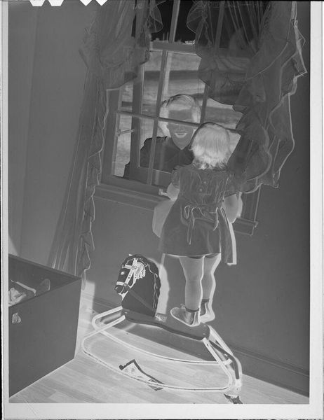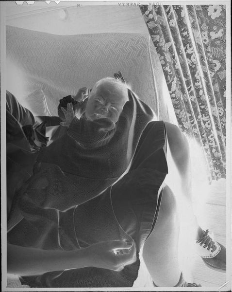 Editor: This photograph, simply titled "Untitled (woman with infant in lap)," by Lucian and Mary Brown, presents a rather stark image. The negative print gives it a ghostly effect. What social dynamics do you see at play here? Curator: It's interesting to consider how the Browns’ work engages with the politics of representation. The reversal transforms a familiar subject into something unsettling, forcing us to confront the cultural expectations we bring to images of motherhood. Editor: Unsettling, yes. It challenges my initial assumptions. How did this photographic style affect its reception? Curator: The negative image disrupts easy consumption; it makes us question the power dynamics inherent in the act of looking, and it highlights the constructed nature of photographic truth. The question remains, whose gaze are the Browns challenging, and what societal norms are they subverting? Editor: It’s fascinating how a simple reversal can provoke so many questions about power and perspective.