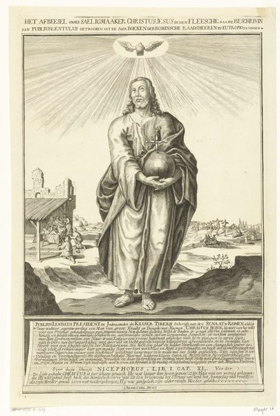 Antonio Tempesta created this small etching of H. Marcellina in the late 16th or early 17th century. Immediately, one notices how the saint's figure dominates the composition, framed by an ornate oval border. Her elongated form and upward gaze create a sense of verticality, contrasted by the horizontal landscape elements. Tempesta’s use of line is particularly striking. The intricate network of fine lines not only models the drapery and landscape, but also serves a deeper purpose. The density and direction of these lines create tonal variations, giving volume and depth to the otherwise flat surface. The formal structure invites a semiotic reading, where the saint's posture and halo function as signs of holiness. The landscape, with its distant buildings, might be seen as a symbol of earthly life, from which Marcellina is turning away. This interplay between the earthly and the divine, rendered through the language of line and form, provides a glimpse into the spiritual and artistic concerns of the time. Note how this detailed use of line shapes not just our visual but also our intellectual engagement with the piece.