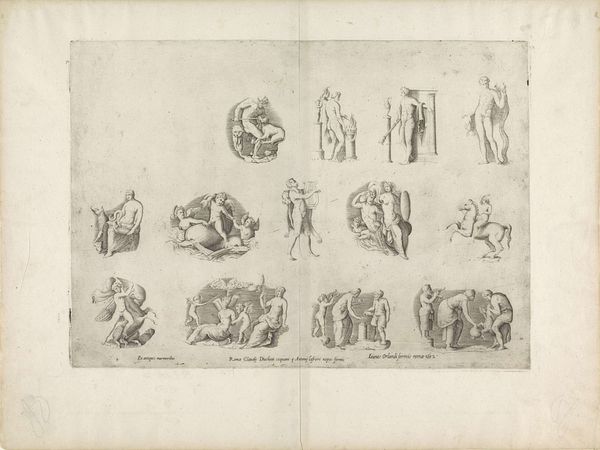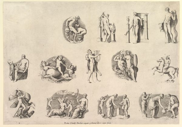 Curator: Let's turn our attention to "Speculum Romanae Magnificentiae: Subjects after Antique Cameos and Gems," an engraving dating roughly from 1545 to 1582. Editor: It strikes me as a visual catalog—a collection of small, contained narratives. The density of figures gives it a very classical feel, doesn't it? A rather restrained, intellectual one, at that. Curator: Precisely. The print method employed enhances a reading of discrete units, yet look how each scene reinterprets established iconographic programs. The consistent, rhythmic engraving style allows for legibility across the varied scenes. Note, for instance, the recurrence of triumphal and sacrificial imagery. Editor: You're right; recurrent themes definitely emerge. There's a clear fascination with classical myths—nymphs, satyrs, gods. The narratives depicted seem deeply embedded in the collective consciousness of that time. These are all figures familiar in pose, proportion, and placement across cultures. I sense a deliberate attempt to capture the weight of the Roman Empire through its popular symbols. Curator: The engraving’s tonal range also reinforces the allusion to bas-relief sculpture. Notice the deliberate use of hatching to define form and create areas of shadow and light. In its adherence to proportion and its implied classical ideals, the entire print reflects Renaissance values, perhaps in dialogue with humanist theories about representation. Editor: Absolutely, one can see the Renaissance fascination with recovering and recasting the antique world; I think it reflects the time period and offers commentary through visual reference. Do you agree that there may be a social or political message regarding Italian power struggles encoded in that emphasis? Curator: An intriguing theory, I can't disagree, but beyond subject matter, its structure warrants study—how it encapsulates many images on one plane, how form dictates meaning and our interpretations as beholders of this printed scene. Editor: So, in the end, both image and process reflect the spirit of the age in an emblem or message. A visual study with much to tell!
