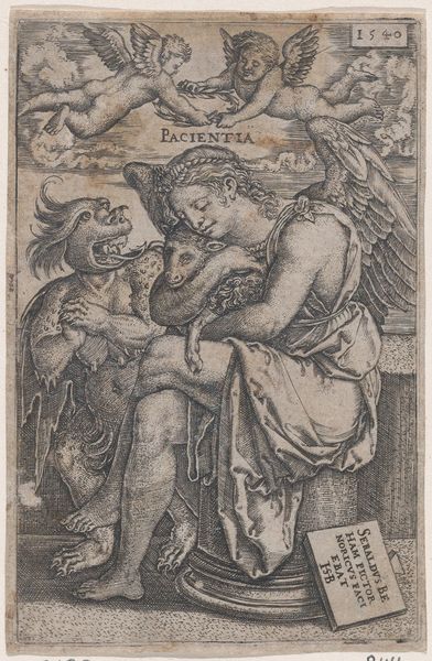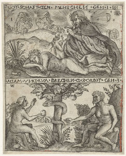 This is an anonymous print titled "Eva met de slang" at the Rijksmuseum, measuring 150 mm in height and 87 mm in width. This image comes to us from a time when the story of Adam and Eve was frequently used to reinforce societal norms, particularly regarding gender roles. Eve, often portrayed as a symbol of temptation and the downfall of mankind, embodies the patriarchal anxieties of the time. The prevailing narrative paints her curiosity and desire for knowledge as the original sin, thus cementing women's subordination. Here, Eve is depicted at the moment of decision, the apple extended in her hand, her body presented as both beautiful and dangerous. How might the anonymous artist have felt about this scene? What did they want us to feel? Look closely. The figures in the upper register seem to be watching. This image, while rooted in religious text, also highlights the complex and often contradictory ways in which women's bodies and desires have been represented throughout history.