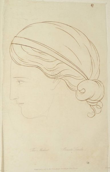 Curator: This is a drawing by Lady Wharncliffe, created sometime between her birth in 1776 and death in 1853. It is a red chalk study of a figure on a page in what appears to be a sketchbook. Editor: The sanguine medium gives it a certain warmth, doesn't it? The composition feels classical, even academic, yet approachable, immediate. Curator: Sanguine was favored in the Renaissance to capture the warmth of the human body. The drawing evokes a sense of idealized beauty, linking to traditions of classical art and the use of putti as symbols of innocence. Editor: Note the layered application of the chalk, creating volume, particularly in the head turned in profile. It's interesting how the artist uses line weight to direct our gaze. Curator: Right. This is definitely an intimate, personal exploration of beauty and form, embedded within a larger tradition. Editor: It leaves me with a sense of quiet admiration for Lady Wharncliffe's skill and this glimpse into her creative process.