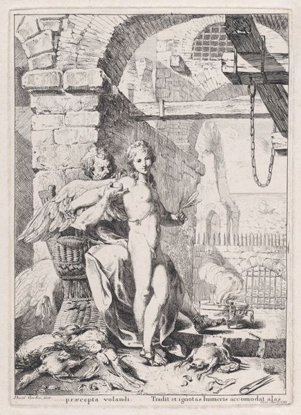 Aegidius Sadeler II created this engraving, Hercules and Cerberus, sometime between the late 16th and early 17th centuries. This print captures a moment from the myth of Hercules, specifically his twelfth labor, where he's tasked with capturing Cerberus, the three-headed dog guarding the entrance to the Underworld. Sadeler’s work reflects the Renaissance fascination with classical mythology, but it also participates in the period's complex negotiations of power, control, and the monstrous. Hercules, often seen as the epitome of masculine strength, is depicted here not just as a hero, but as a figure of dominion over the untamed, the "feminine," the chthonic. The chained Cerberus becomes a symbol of subjugated wildness, a visual metaphor for the era's colonial and patriarchal impulses. The emotional tenor of this piece is one of conquest, but it also hints at the unease of controlling something inherently uncontrollable. Ultimately, this engraving invites us to reflect on the stories we tell about power and how these narratives shape our understanding of self and other.