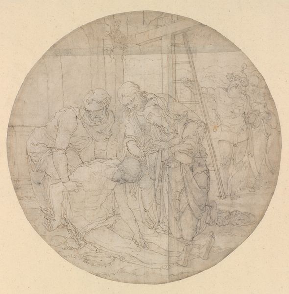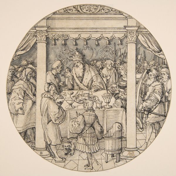 Editor: This drawing, “Ongelovige Thomas,” or “Doubting Thomas,” by Nicolaas Hogenberg, was made before 1527 using ink and charcoal on paper. The way Hogenberg uses line is striking; it’s delicate, but still conveys such strong emotion. What do you see in this piece, Professor? Curator: Immediately, the composition presents itself. Hogenberg employs a circular format, or tondo, typical of the Italian Renaissance, which encourages the eye to move continuously, taking in each figure and detail. Notice the strategic use of hatching and cross-hatching to create tonal variation, suggesting depth and volume in the figures. What impact do you think the medium and technique have on the overall meaning? Editor: I think the ink and charcoal, and especially the cross-hatching, adds to the solemn nature of the work. It's like each stroke adds another layer of doubt and then eventual acceptance, you know? Curator: Indeed. Consider the spatial arrangement of the figures. Thomas, isolated slightly from the others, reaches to touch Christ’s wound, the focal point emphasized by the convergence of lines and gazes. This tactile engagement is key; it visually represents the transition from doubt to belief, underscoring the power of empirical evidence. Have you also noticed the architectural setting? Editor: I did! The arches and pillars feel very… structured, almost rigid. Does that contrast emphasize Thomas’s emotional state somehow? Curator: Precisely. The rigidity of the architectural space contrasts with the fluidity of the figures' drapery, further highlighting the central drama. Ultimately, Hogenberg’s formal choices underscore the narrative's central theme: the interplay between faith, reason, and visual proof. Editor: I hadn’t considered how the architectural elements played such a crucial role! Seeing how line, composition, and even the shape of the artwork itself contribute to its message gives me a new appreciation for it. Curator: Indeed, the true artistry is revealed through an examination of each carefully selected artistic element.