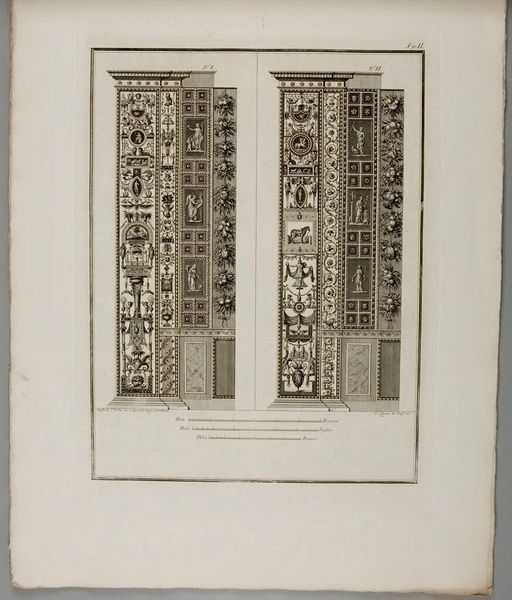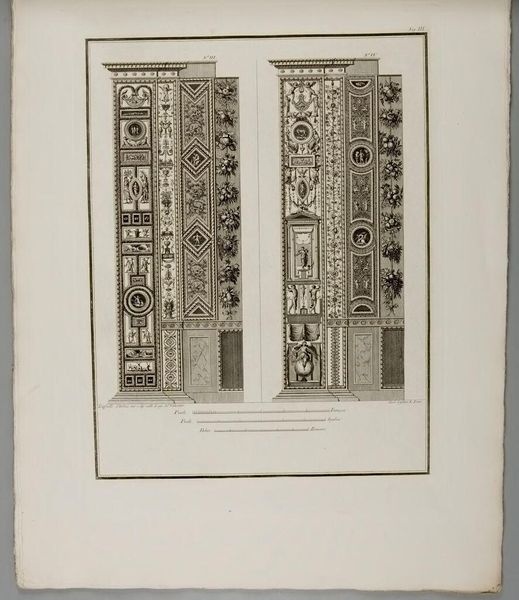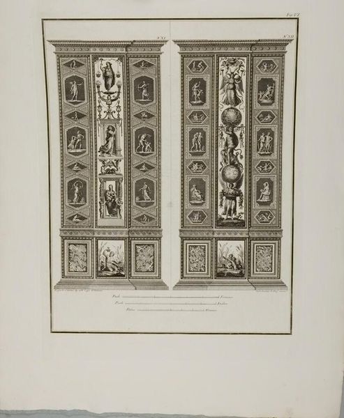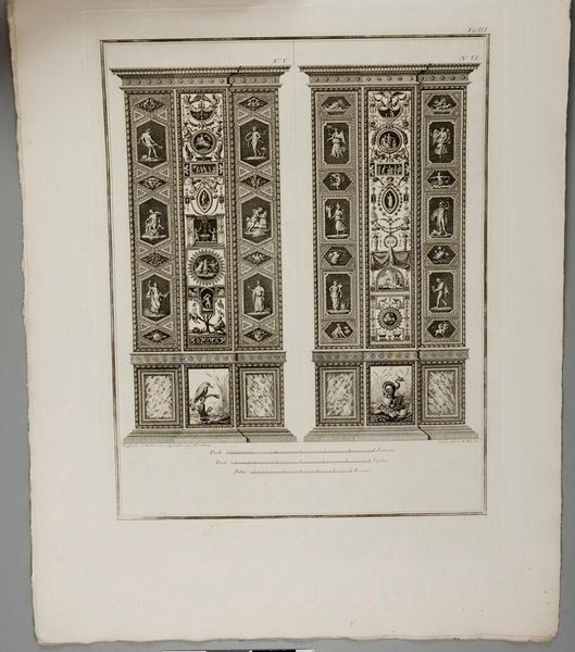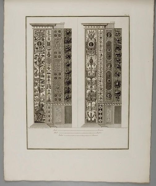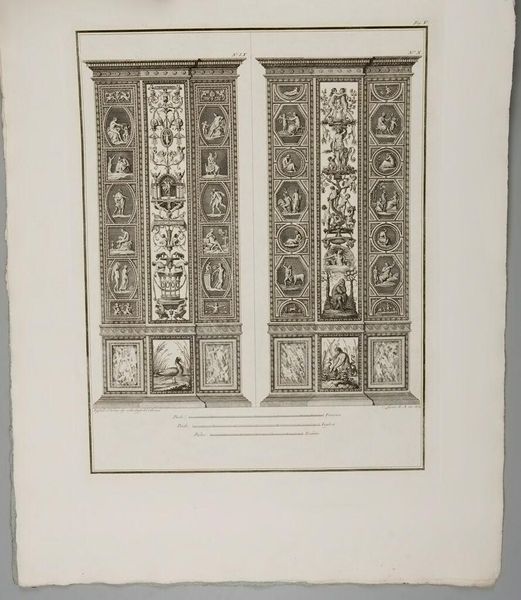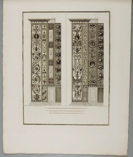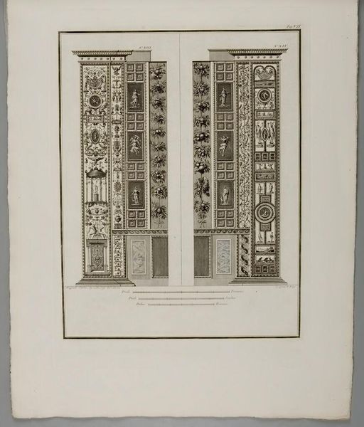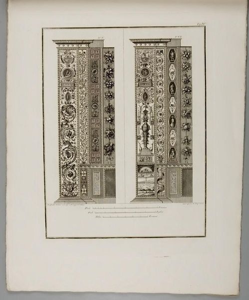 Curator: Here we have Conte Carlo Lasinio's "Fresco of the Vatican Loggia," a detailed rendering showcasing the architectural ornamentation. It’s currently housed at the Harvard Art Museums. Editor: It feels almost like sheet music, doesn't it? All these carefully placed figures and decorative lines... it's both precise and somehow dizzying. Curator: Precisely! Lasinio meticulously documented the Vatican Loggia's frescoes, capturing the era's fascination with classical motifs and design. It is interesting to view this work through the lens of cultural appropriation. Editor: I see it too – this intense need to categorize and contain beauty. Does cataloging something make it yours? Curator: That's a potent question to consider when examining this artwork within the broader context of art history and power dynamics. Editor: It makes me wonder what stories these walls would tell if they could speak. Curator: An intriguing speculation. Thinking about its layered meanings definitely gives us a new perspective.