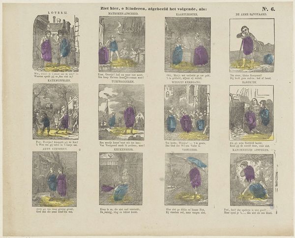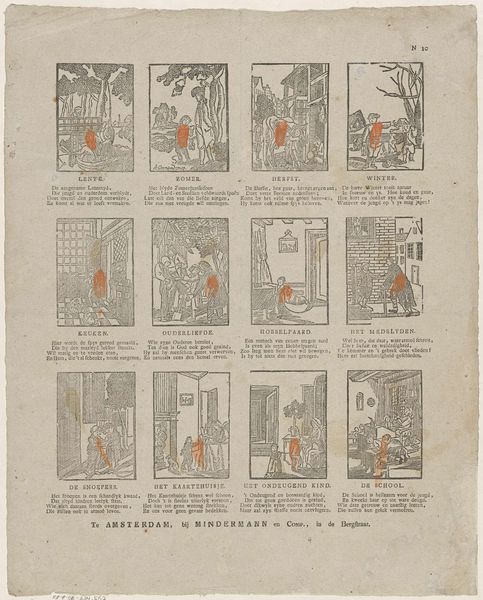 Editor: This is an interesting piece. It's called "Wat Moeder Gans vertelt..." which roughly translates to "What Mother Goose Tells...", created between 1832 and 1850 by W. & J. Hissink. It's a printed work featuring multiple vignettes. I’m immediately drawn to the way it feels like a very early form of a comic strip. What do you see in this piece that might resonate with its cultural moment? Curator: The seemingly simple nature of this work belies its connection to deeply embedded cultural narratives. Notice how the artist uses a sequential arrangement, much like a storyboard. Each little scene acts as a mnemonic device. Do you recognize any of the stories being referenced? Editor: Yes, I see Cinderella and Puss in Boots. They are both there in separate vignettes. Curator: Exactly! These weren’t just whimsical drawings, they served as visual shortcuts to shared stories. These familiar tales, already circulating in the oral tradition, were being codified and disseminated through print. Consider the repetition of specific visual cues across different cultural interpretations of Cinderella, for example, or the cat's prominent boots. Editor: That's fascinating! It’s like a proto-meme, where a shared understanding amplifies the meaning. Curator: Precisely. The artist utilizes these iconic symbols as a form of cultural shorthand. It speaks to a society eager to engage with narratives that reinforce their shared values and anxieties. It invites reflection on what is considered home, family and the outside world of fortune or risk. The images help solidify a shared identity and meaning. Editor: So it's not just about the story itself, but also how the story connects people. It also gives meaning through objects like the boot of Puss and even Cinderella's hearth? I didn't appreciate that level of depth before! Curator: Absolutely. Seeing these stories as shared cultural memory woven into a visual narrative transforms our understanding.