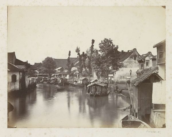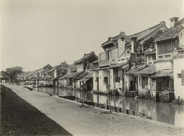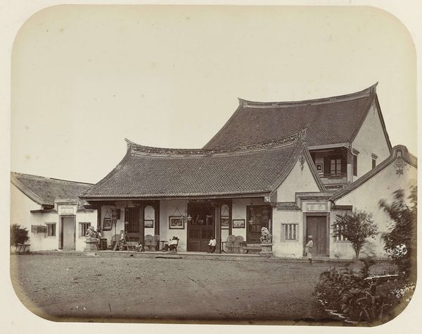 Editor: So, this is "Straatgezicht op Java" by Woodbury & Page, taken sometime between 1857 and 1870. It's a photograph, and it strikes me as a really interesting snapshot of a time and place I know very little about. It has a stillness, despite the people. What stands out to you in this piece? Curator: What resonates most profoundly with me is how the photograph captures a cultural memory in transition. Look at the architecture; these are colonial structures superimposed upon a pre-existing Javanese context. Notice the ghostly figures – an artifact of the longer exposure times typical of early photography, almost suggesting that time itself is in motion. Editor: I hadn’t considered that! The figures really do feel like a trick of the light, they could even be perceived as ancestral ghosts! So you are suggesting that this intersection of Javanese life and colonial influence is central to the photograph's symbolic weight? Curator: Precisely! Consider the composition: the road, dominating the foreground, almost seems to invite the viewer into this world, yet it simultaneously emphasizes a divide, between us and them, past and present. This image doesn’t simply show a street scene; it prompts us to contemplate the psychology of encounter, the ways cultures observe and interpret one another. How do you think that visual language impacts contemporary viewers? Editor: That makes me rethink the role of photography in colonialism! Now I am viewing the piece in terms of power and perspective. I think I’m beginning to see how it shows culture in transit rather than simply depicting Java. Curator: And isn't that the power of imagery, to reveal cultural memory not as static history, but as an evolving dialogue? Editor: Definitely. This photo carries a lot more depth and historical context than I first thought. Thanks for helping me delve deeper.