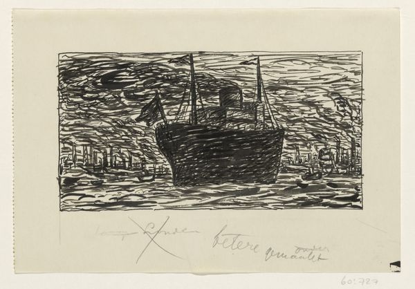 Leo Gestel's 'Ship Entering the Port of London' is a drawing which gives us a glimpse of an industrial landscape rendered in stark black ink. You can see how Gestel creates a sense of movement and atmosphere through layered, energetic marks. It’s not about photographic likeness, it’s about a feeling, a fleeting impression. The materiality of the work is really striking. The ink is applied with varying pressure, creating a range of darks and lights which gives depth to the composition. The scratchy lines capture the choppy waves and billowing smokestacks. The ship itself is a solid, imposing form but the rest of the scene is more fluid, almost like a sketch in motion. Notice how the horizon line dissolves into the sky, blurring the boundaries between the natural and the man-made. Gestel's approach reminds me of James Ensor, particularly in the way he uses bold lines and simplified forms to create a sense of drama and unease. Both artists embrace ambiguity, inviting us to question our perceptions of the world.