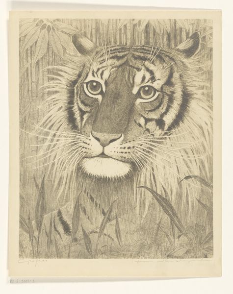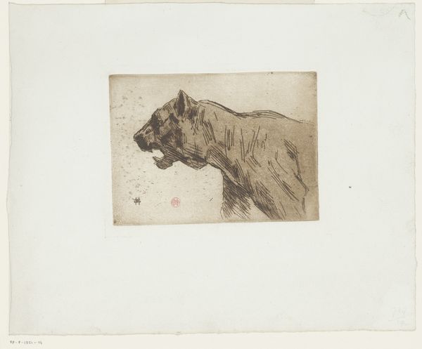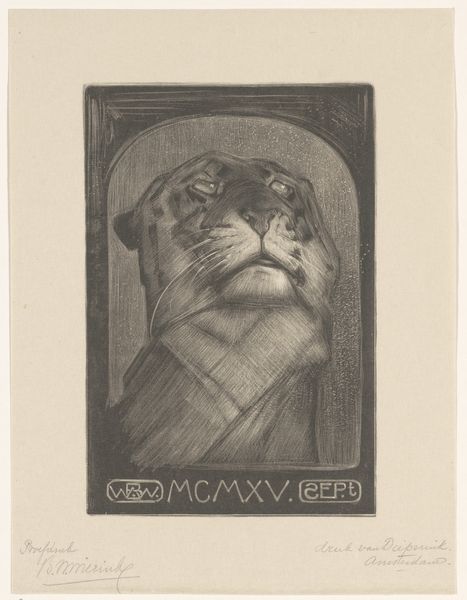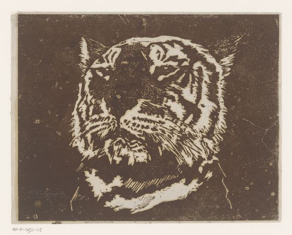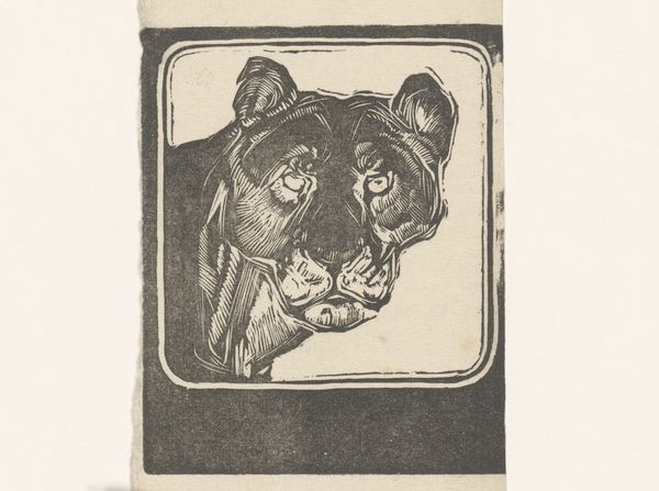 Curator: What a striking piece! We're looking at "Kop van een leeuwin," or "Head of a Lioness," a woodcut print from the Rijksmuseum's collection by Bernard Willem Wierink. It's dated sometime between 1866 and 1939. Editor: I'm immediately drawn to the starkness of the image, the bold contrast of black and white. It feels very direct, almost confrontational in its simplicity. You can practically feel the grain of the wood. Curator: That's a great observation. Wierink's choice of the woodcut technique speaks volumes. Think about the labor involved, the removal of material, the inherent roughness. This wasn’t some quick sketch; this was deliberate subtraction. The image is, in a sense, what’s *left* after the artist’s intervention. Editor: And the framed image. It appears deliberate. That kind of conscious framing is telling; I see it in light of how animal representation shifted across the 19th century. Where does this print fit within changing socio-political roles for animals at that time? I'd want to explore that. Curator: Precisely! The popular press and burgeoning public museums played a large role. But let's consider the print medium itself. It would have made the image widely accessible and available for distribution. The contrast also seems crucial given technological changes in printmaking from photography to print magazines. Editor: Absolutely. These prints became affordable decorations and circulated within very specific visual cultures of the day, shaping public perceptions. Looking at the social impact – how this particular lioness engaged with anxieties, ideas of colonial power or perhaps nature's own raw power. The lioness head motif held powerful associations with nature and colonial themes. Curator: And it goes beyond mere image. We must analyze how Wierink made decisions at the point of production: the conscious choices with respect to labor that produced this artifact with the social purpose. It's not just an image of a lioness; it’s a trace of a creative process embedded in its time. Editor: A lot to think about regarding the piece, especially how this fierce but beautiful animal was rendered through social dynamics and the labor within printmaking technologies of the late 19th century! Curator: Yes, it shows how a particular moment can tell you as much through a print as a painting when it concerns labor and materiality.