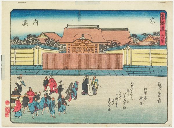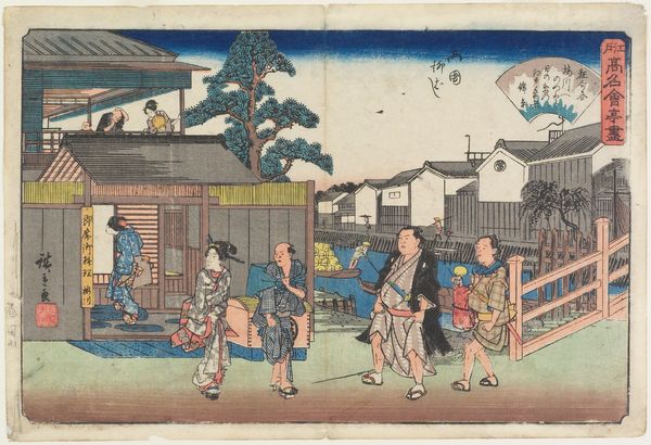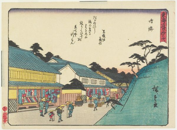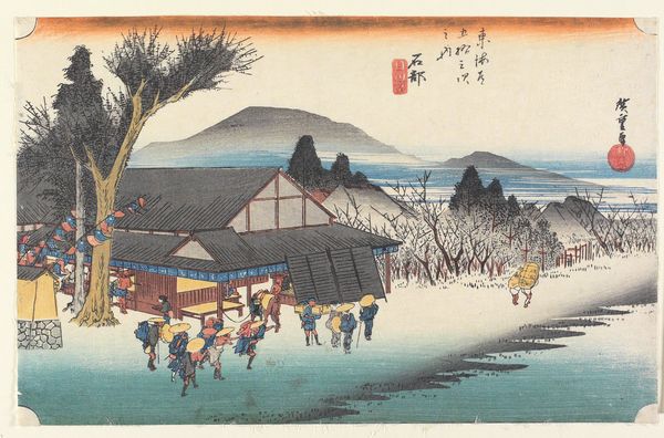 This woodblock print, 'Minakuchi', was created by Utagawa Hiroshige, sometime before his death in 1858. Part of the series 'Fifty-three Stations of the Tokaido Road', it depicts a post station on the highway between Kyoto and Edo, present-day Tokyo. The Tokaido Road was more than just a route; it was a crucial artery of Japanese society. The road facilitated the movement of people, goods, and, importantly, ideas. Hiroshige's series captures not just the landscape, but the bustling social life around it. The figures scurrying around the buildings, and the details of the architecture, together suggest the stratified society of the time, with its rigid social roles. Note the laborers, merchants, and travelers depicted here. Understanding the social and institutional history of the Edo period is key to interpreting this print. Detailed research into travel, commerce, and social customs offers a richer understanding of artworks like this, and the complex world they reflect.