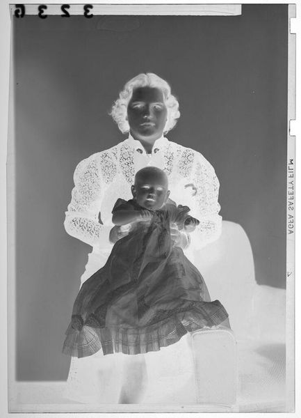 Curator: This is an untitled studio portrait by Martin Schweig, depicting a woman and child. It’s a silver gelatin print. The negative effect gives it an ethereal quality. Editor: That’s a nice way of putting it, because my first thought was almost ghostly. The lace details are so intricate, almost as if woven from light itself. Curator: Exactly! It’s as if Schweig wanted to capture not just their image, but their essence. The woman's dark dress contrasts beautifully with the baby’s white gown. Editor: I wonder about the lace itself – the craft involved, the social status it implied. It would have taken hours to produce that garment by hand. Curator: And what stories it could tell! It reminds me of a Victorian dream, shadowed and sweet. Editor: Yes, a material manifestation of time and dedication, captured in this photographic moment.